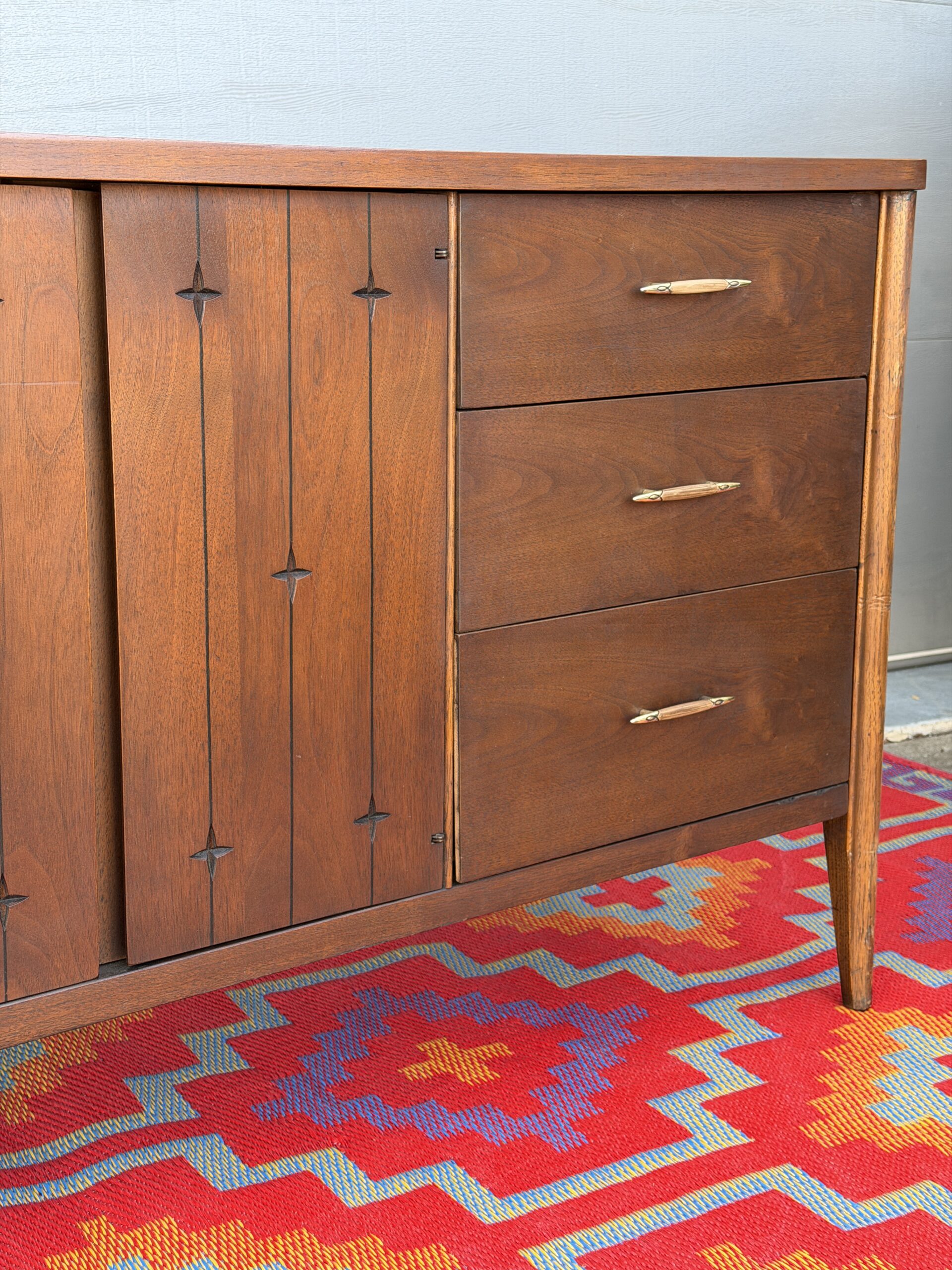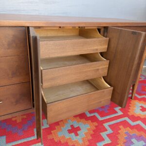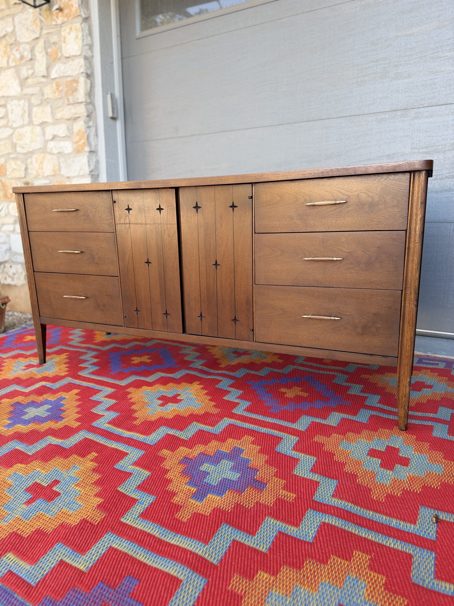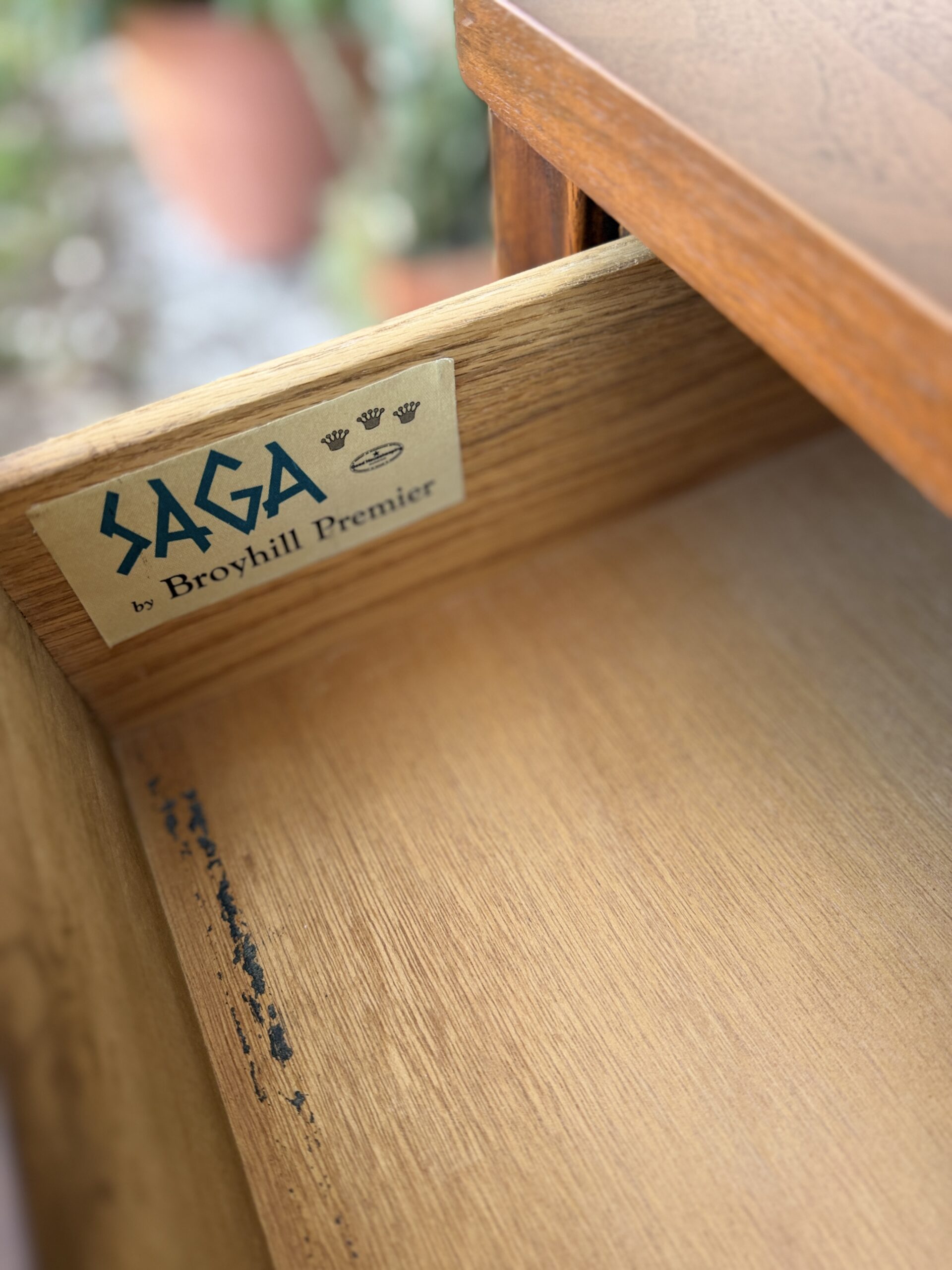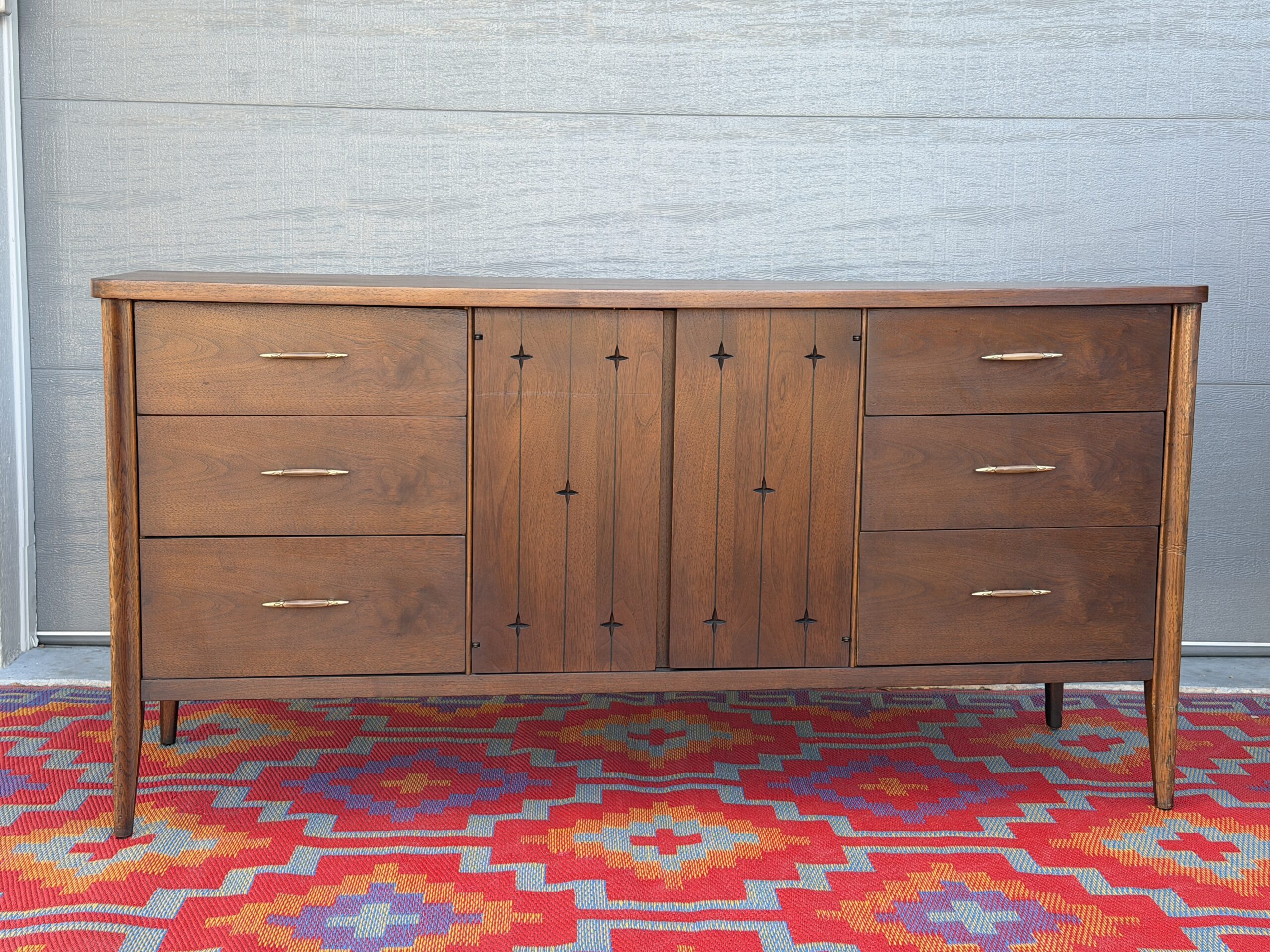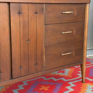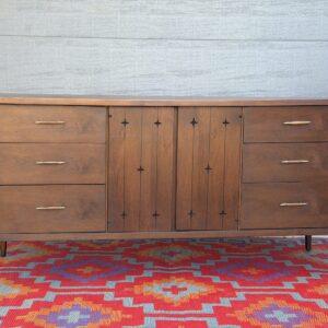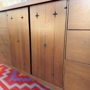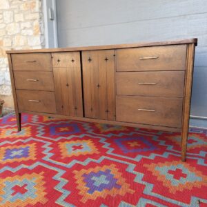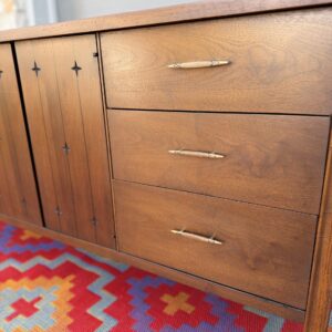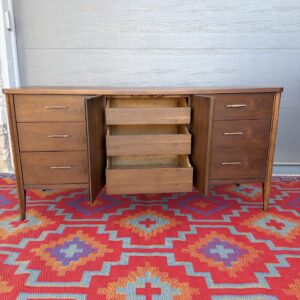 An iconic piece from Broyhill’s celebrated Saga line, this 9-drawer dresser blends sculptural mid-century style with excellent functionality. Featuring the signature starburst-carved center cabinet doors, tapered legs, and warm walnut tones, it’s a standout example of American mid-century craftsmanship.