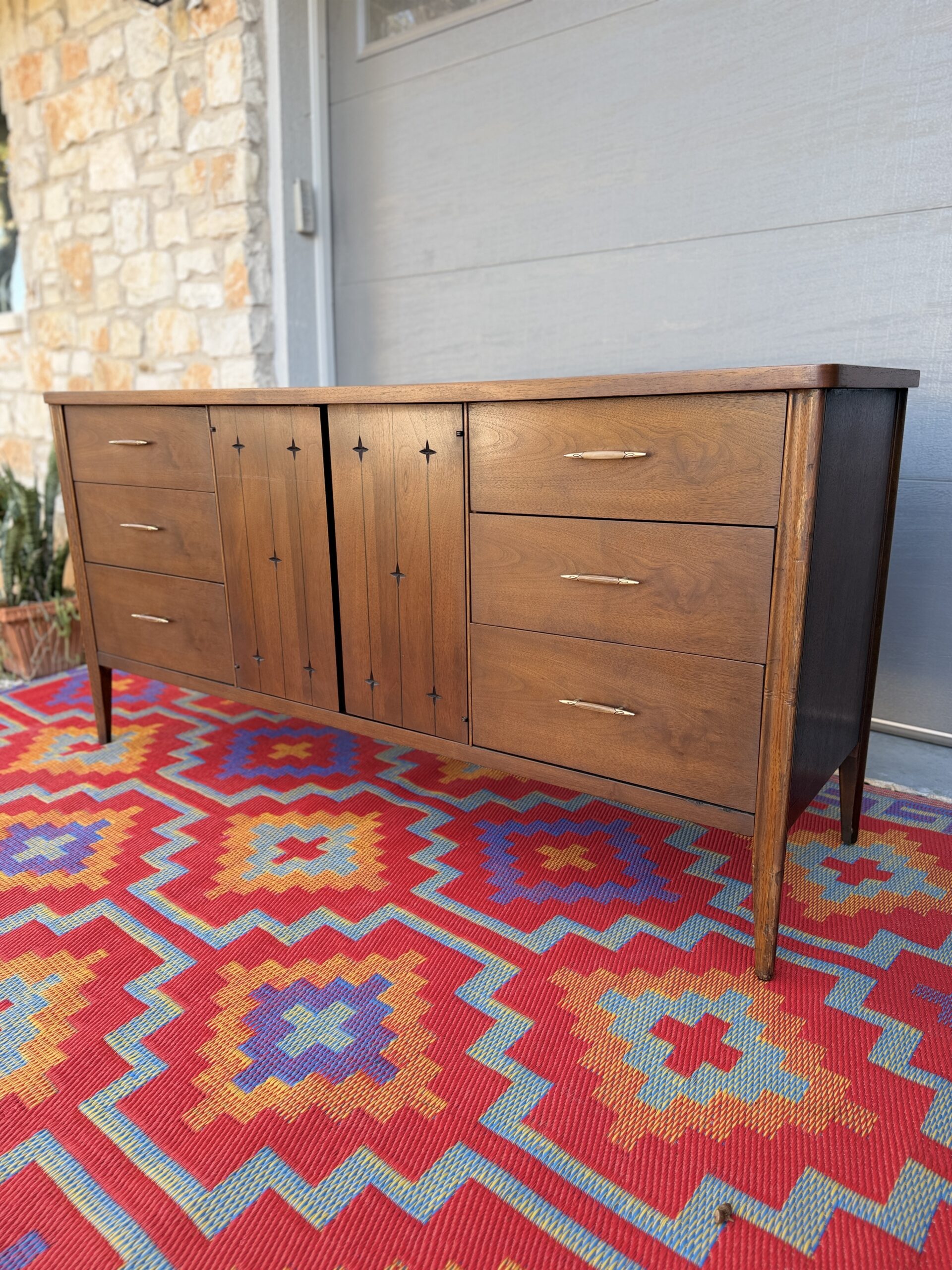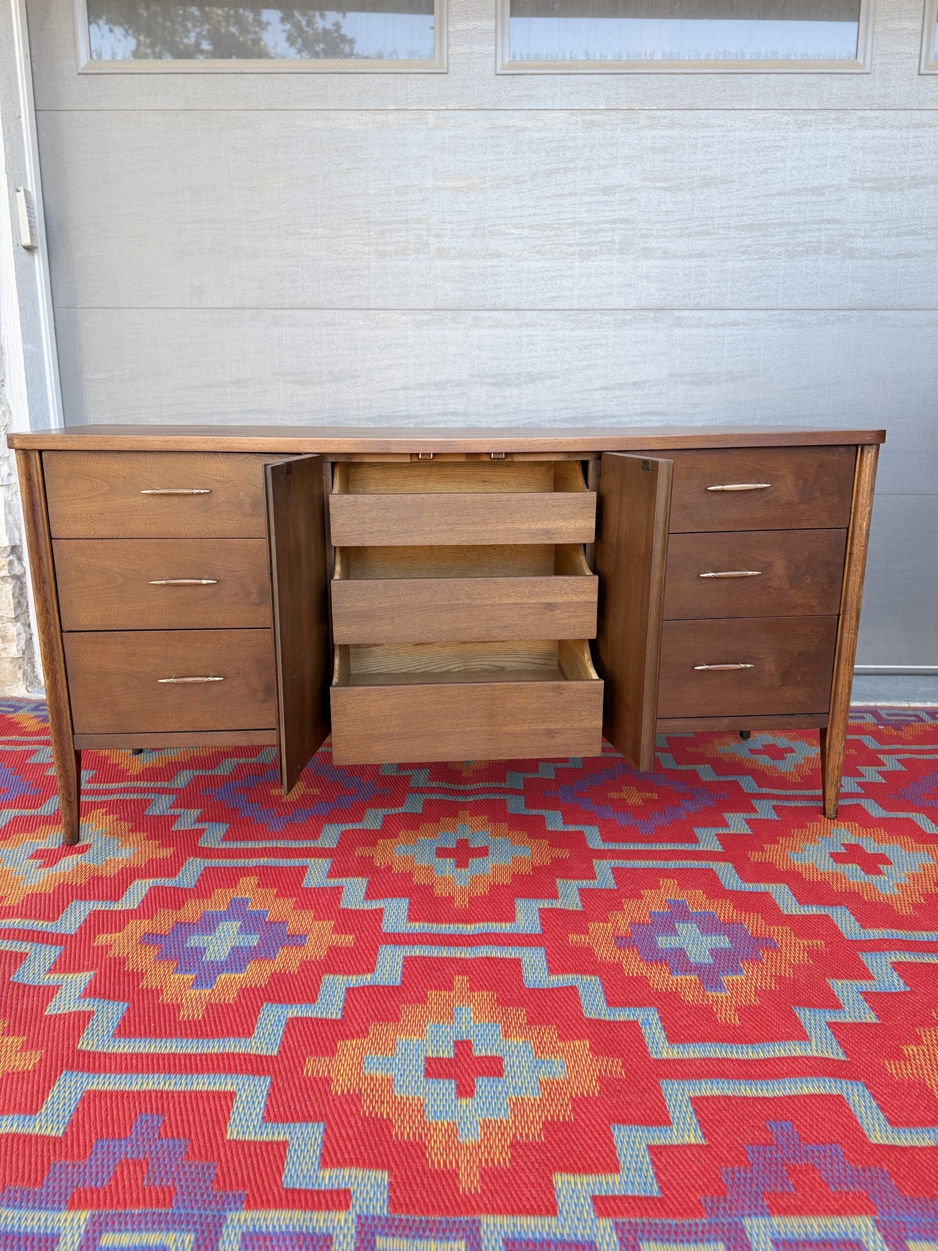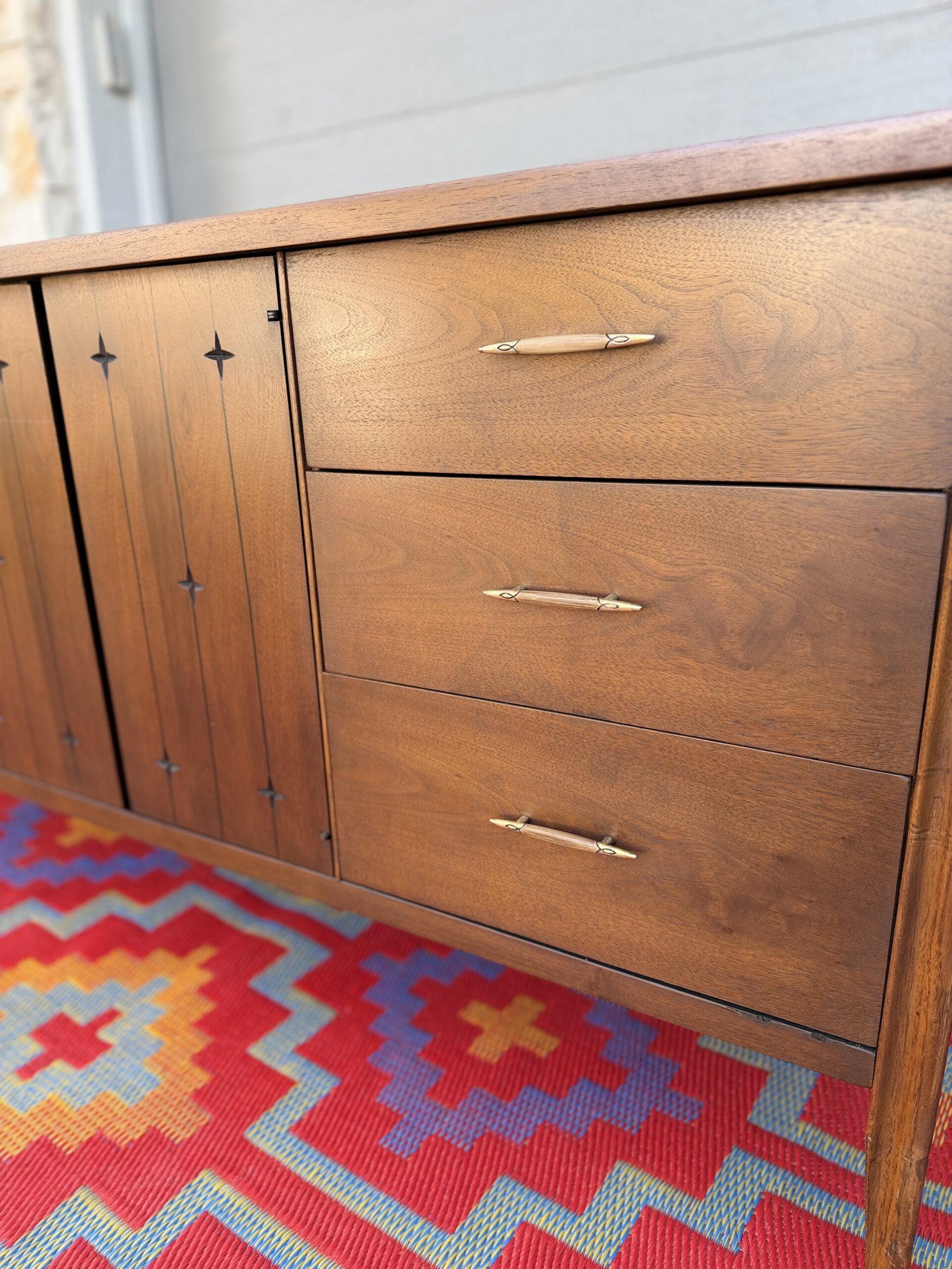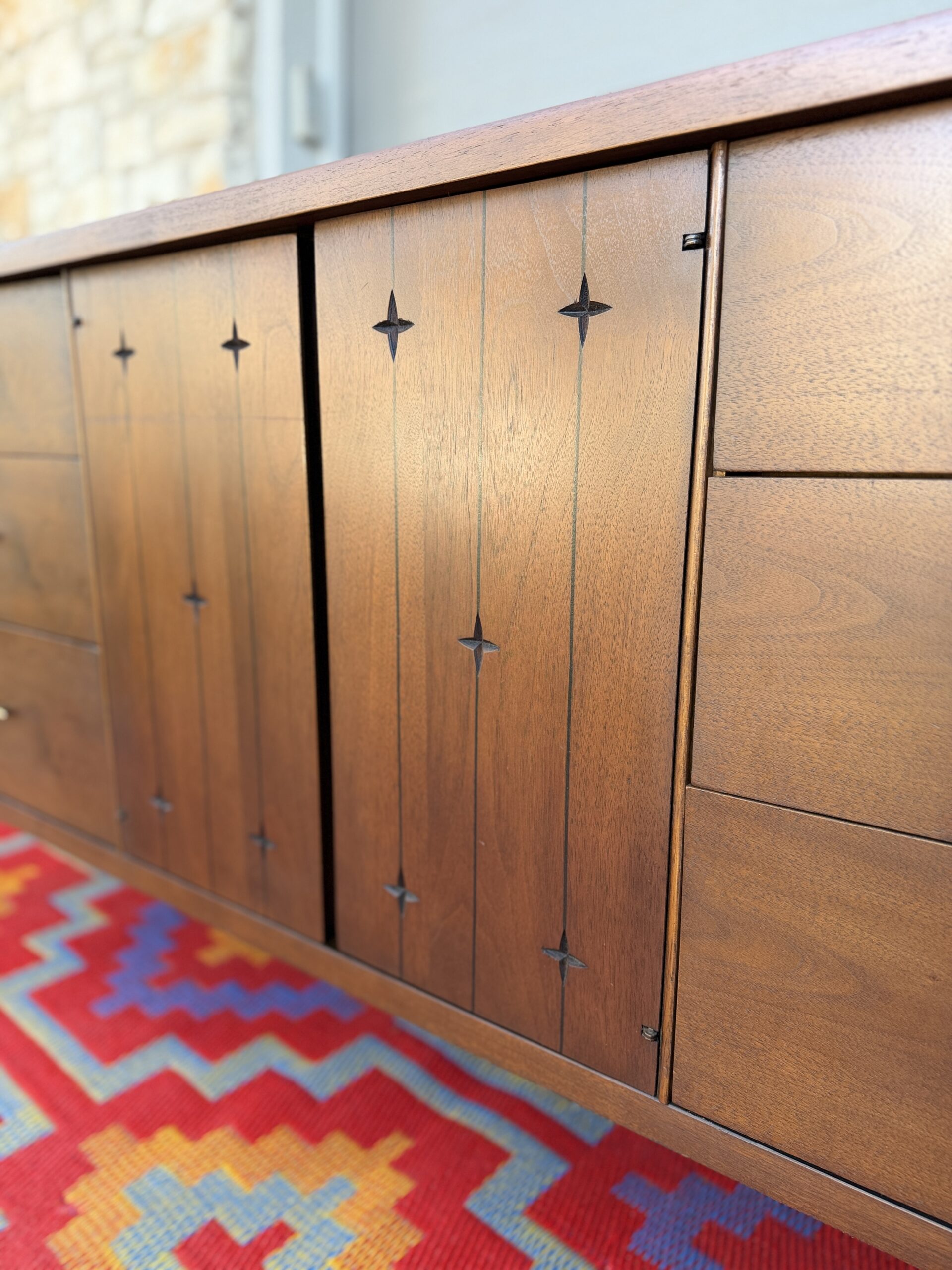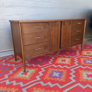 An iconic piece from Broyhill’s celebrated Saga line, this 9-drawer dresser blends sculptural mid-century style with excellent functionality. Featuring the signature starburst-carved center cabinet doors, tapered legs, and warm walnut tones, it’s a standout example of American mid-century craftsmanship.