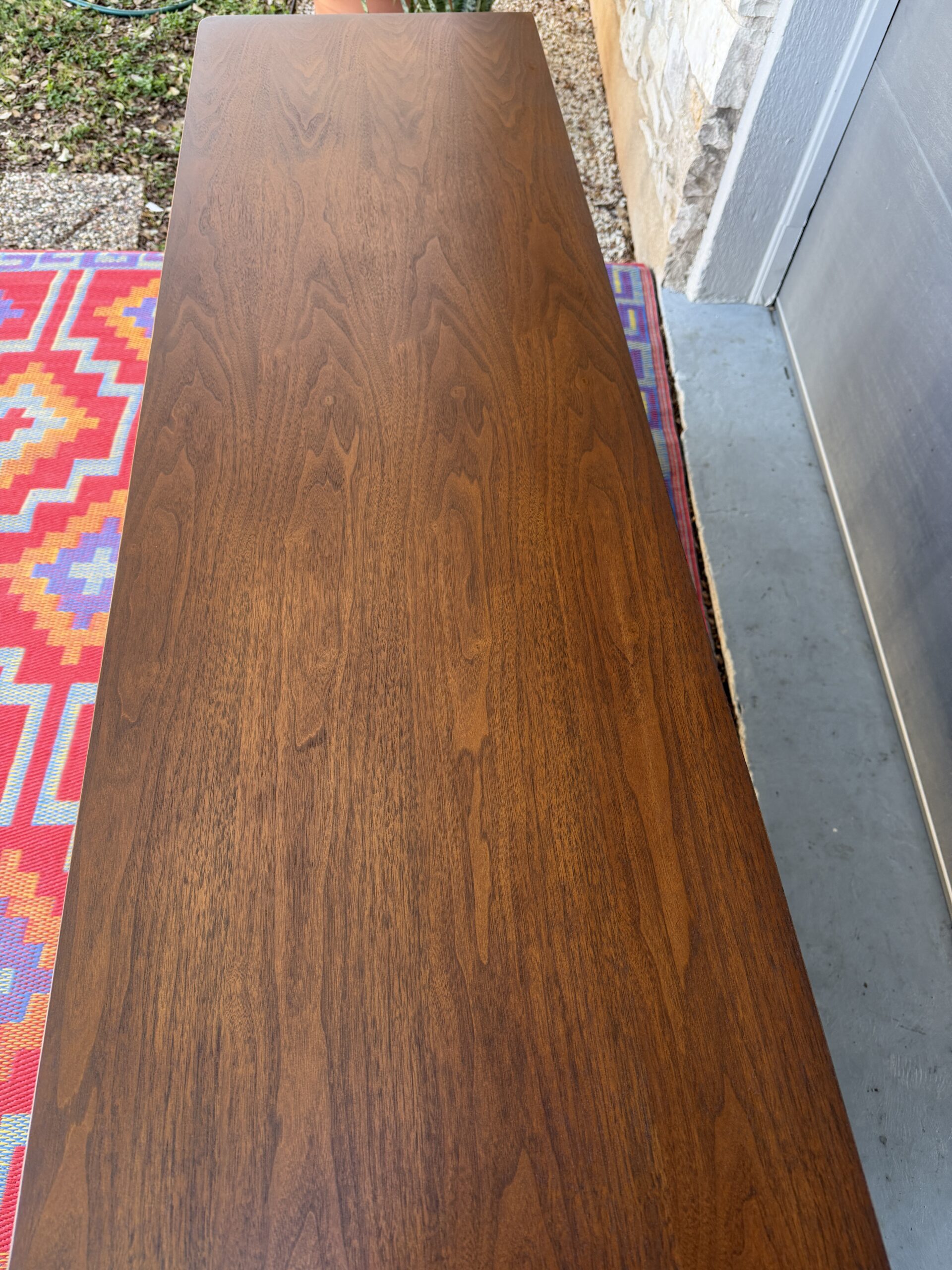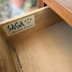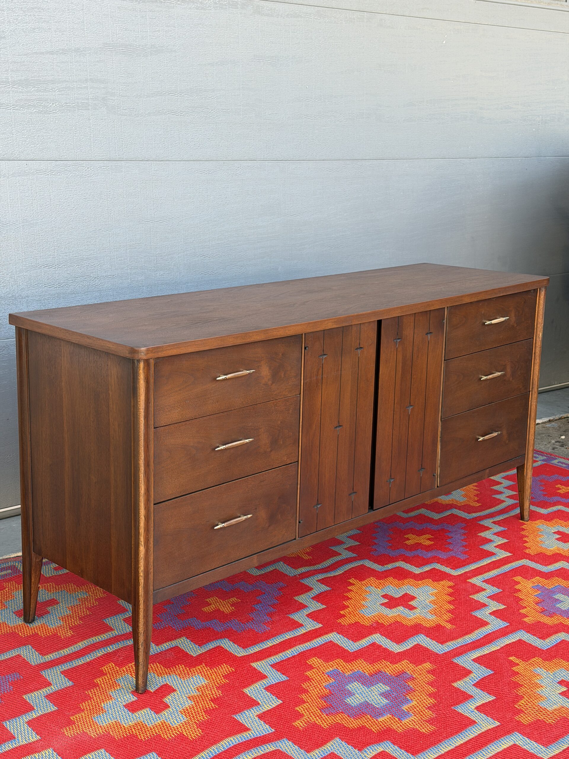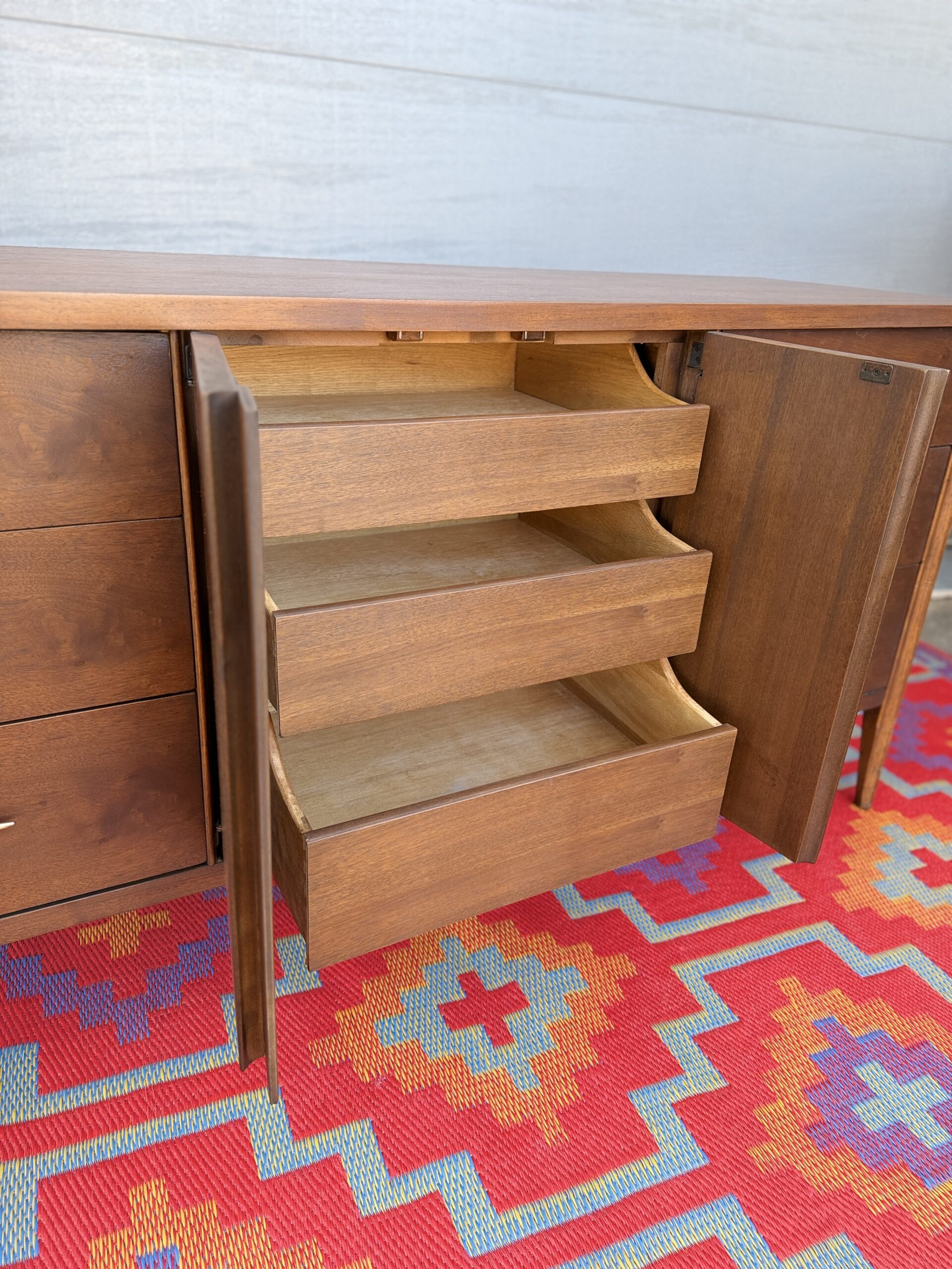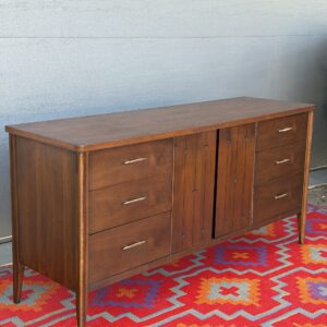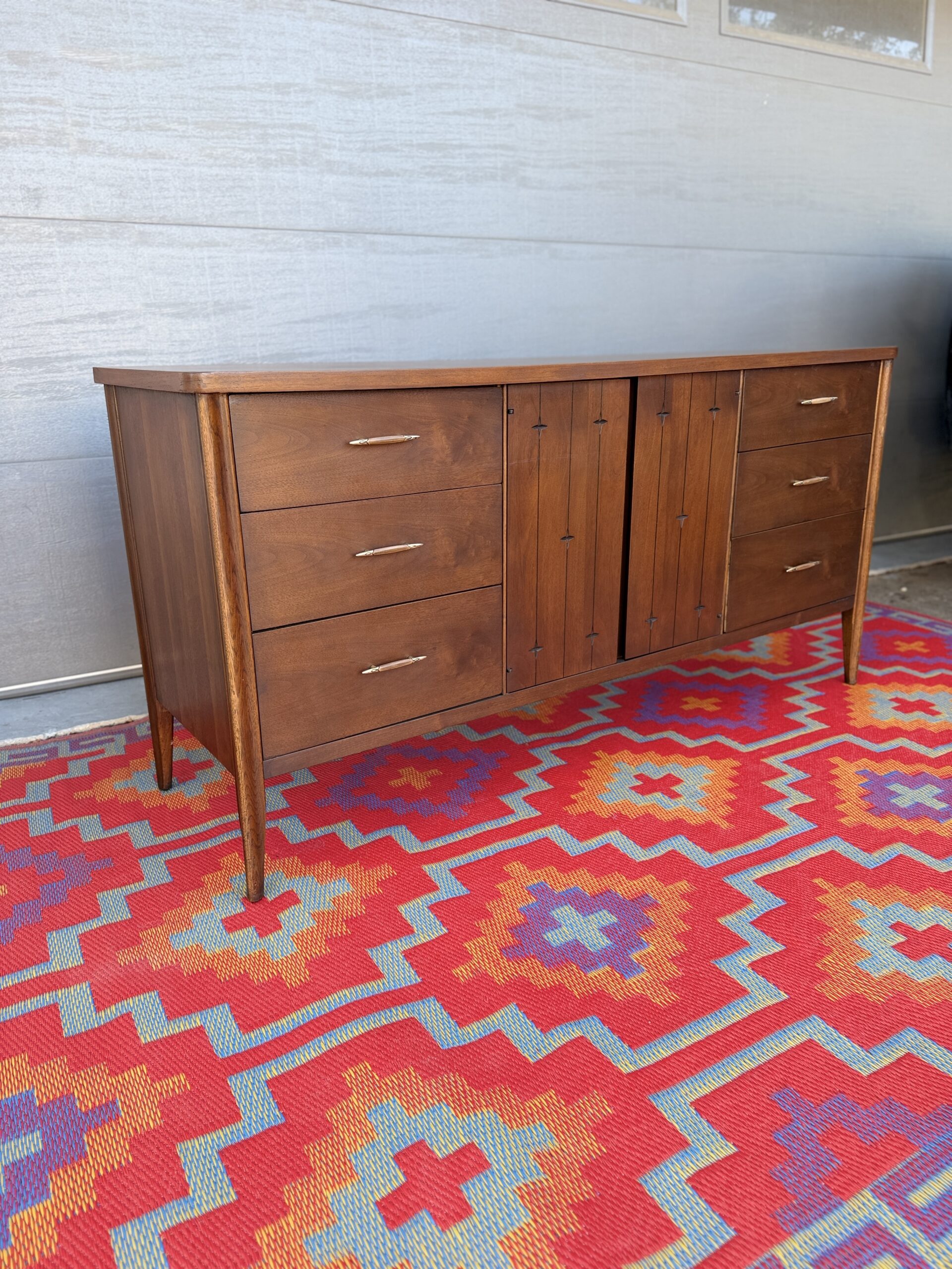 An iconic piece from Broyhill’s celebrated Saga line, this 9-drawer dresser blends sculptural mid-century style with excellent functionality. Featuring the signature starburst-carved center cabinet doors, tapered legs, and warm walnut tones, it’s a standout example of American mid-century craftsmanship.