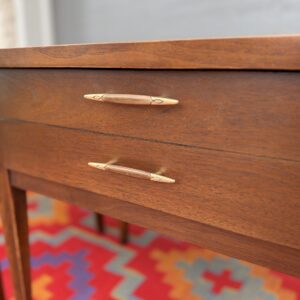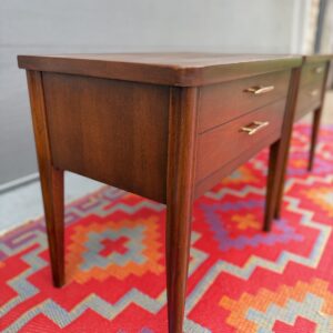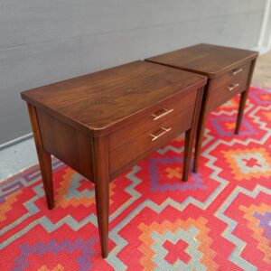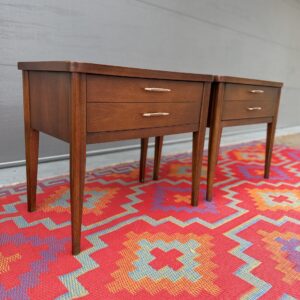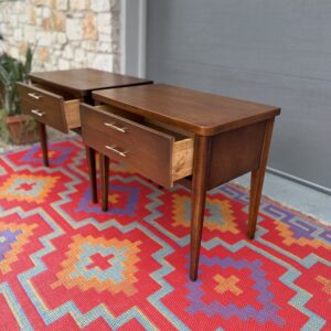 This classic pair of Broyhill Saga nightstands offers that warm, timeless mid-century charm the Saga line is known for. Each table features a single smooth sliding drawer, carved atomic stars, original brass pulls, and clean, tapered legs.