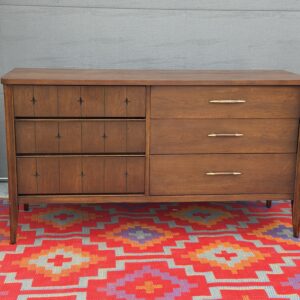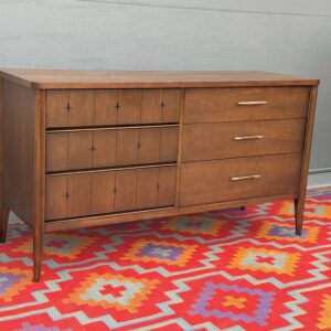 A classic piece from Broyhill’s highly sought-after Saga line, this 6-drawer dresser blends clean mid-century lines with subtle sculptural detailing. The carved starburst drawer fronts give it that iconic MCM character, while the warm walnut tones make it easy to style in any space.