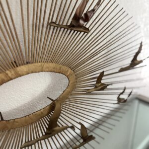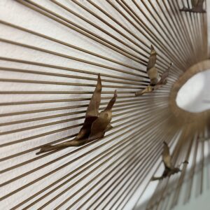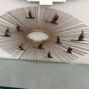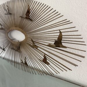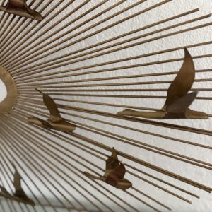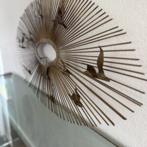 This striking vintage wall sculpture evokes the iconic style of Curtis Jere, featuring a dynamic sunburst form with brass rods radiating outward and a graceful formation of flying birds.