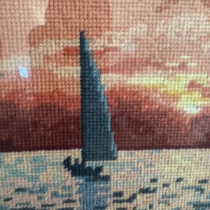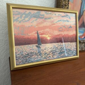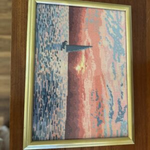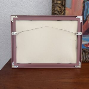 Detailed embroidery of blue, pinks and red in a vintage frame with glass and hanging wire on the back.