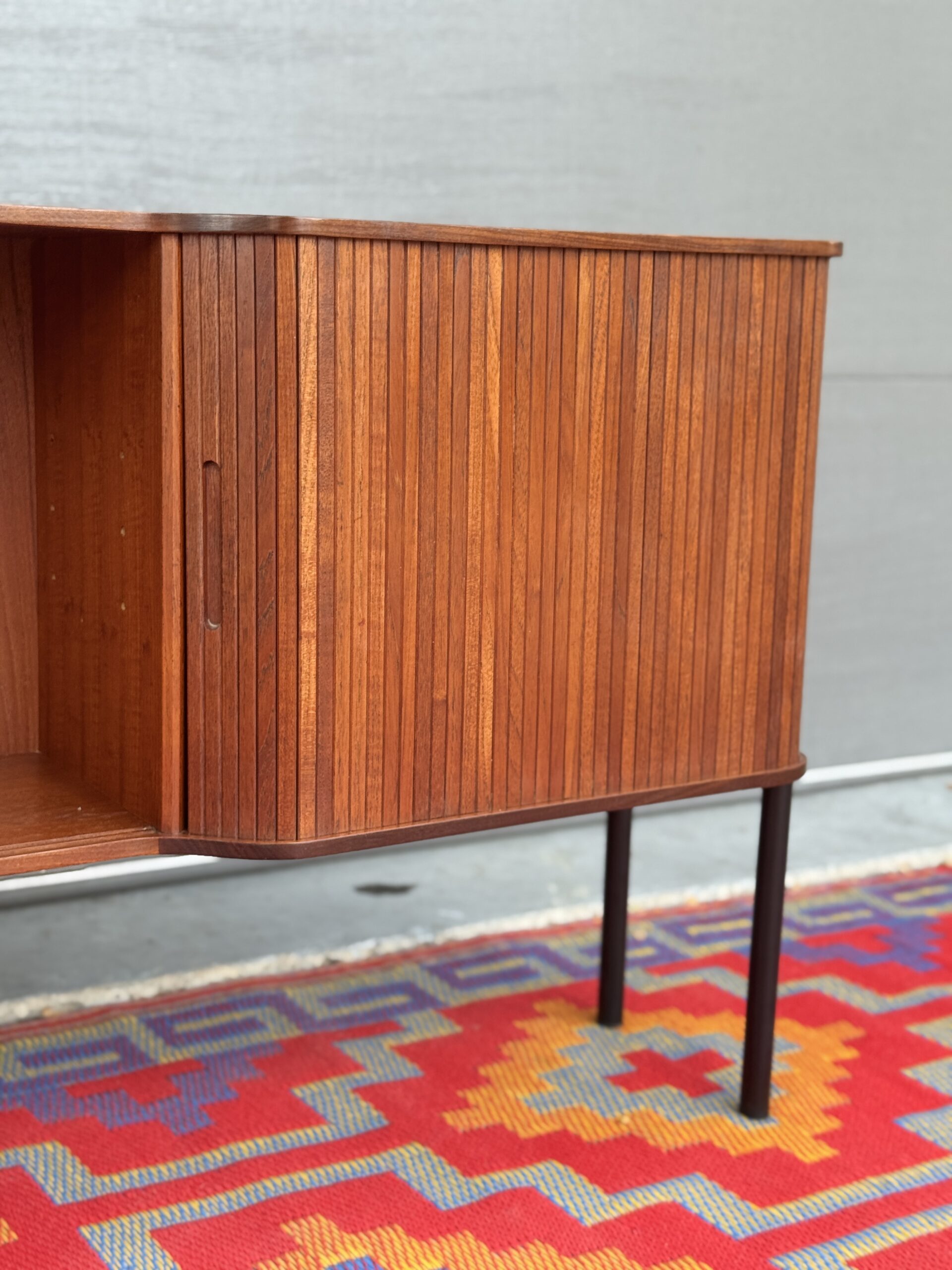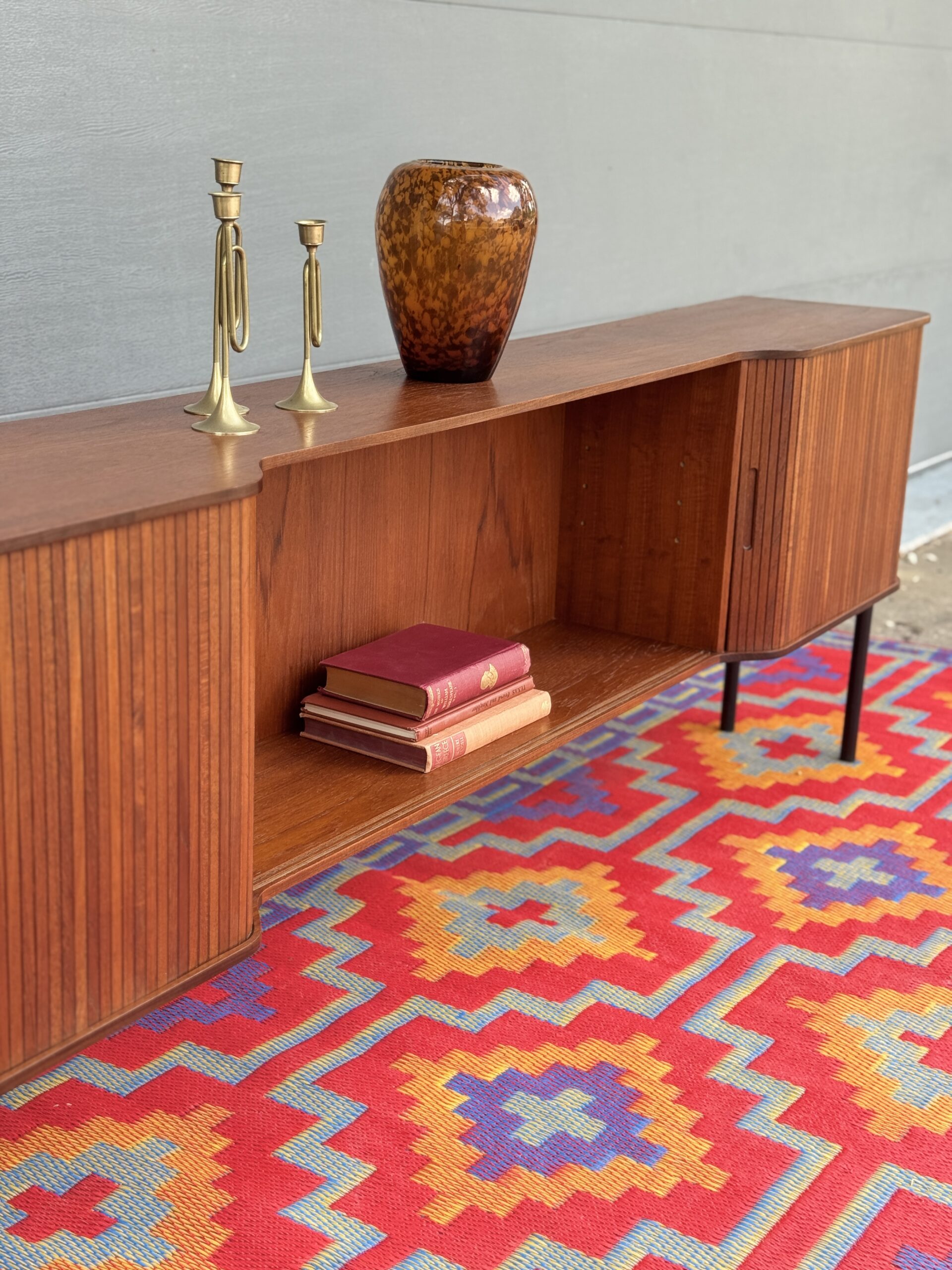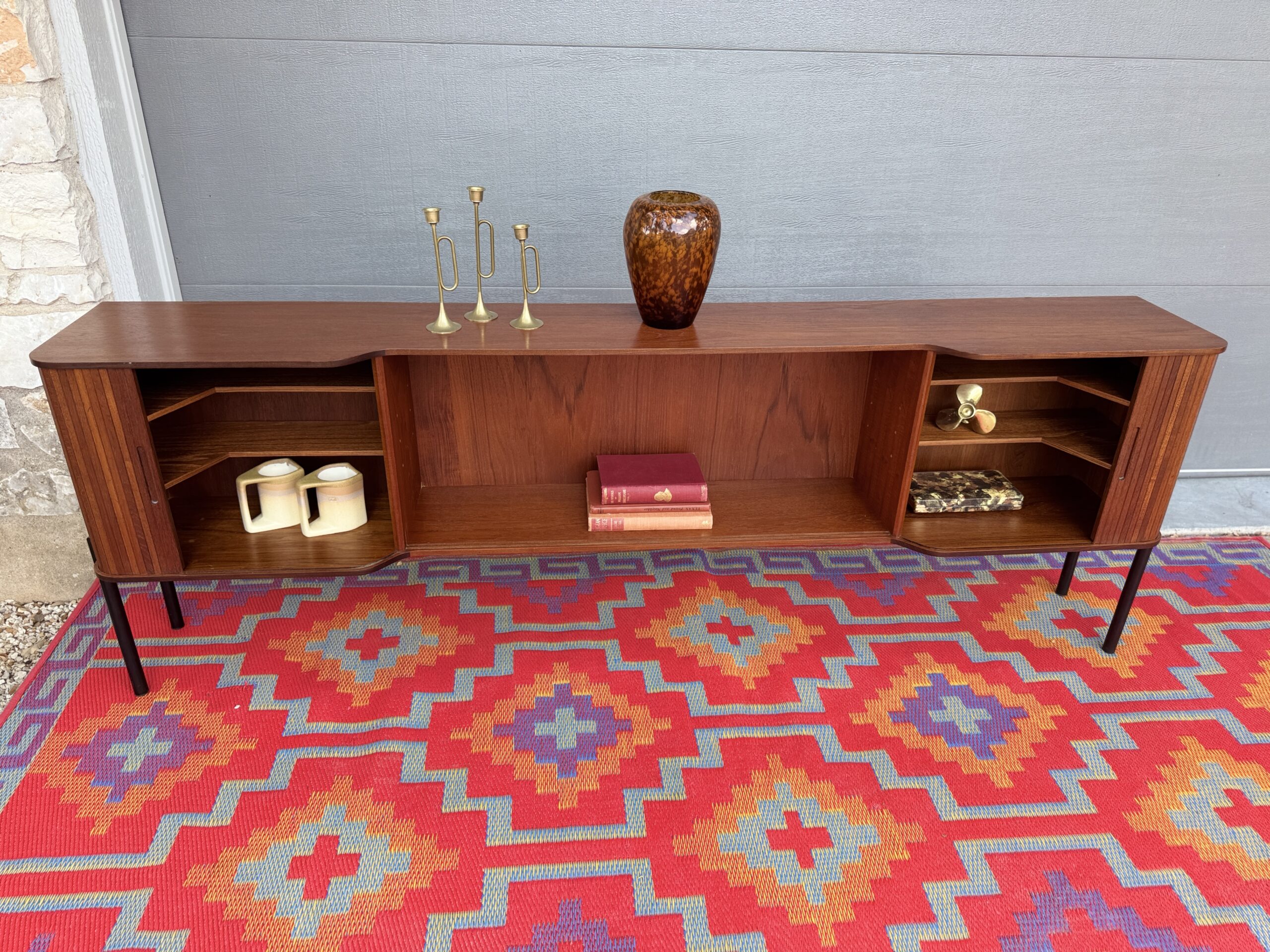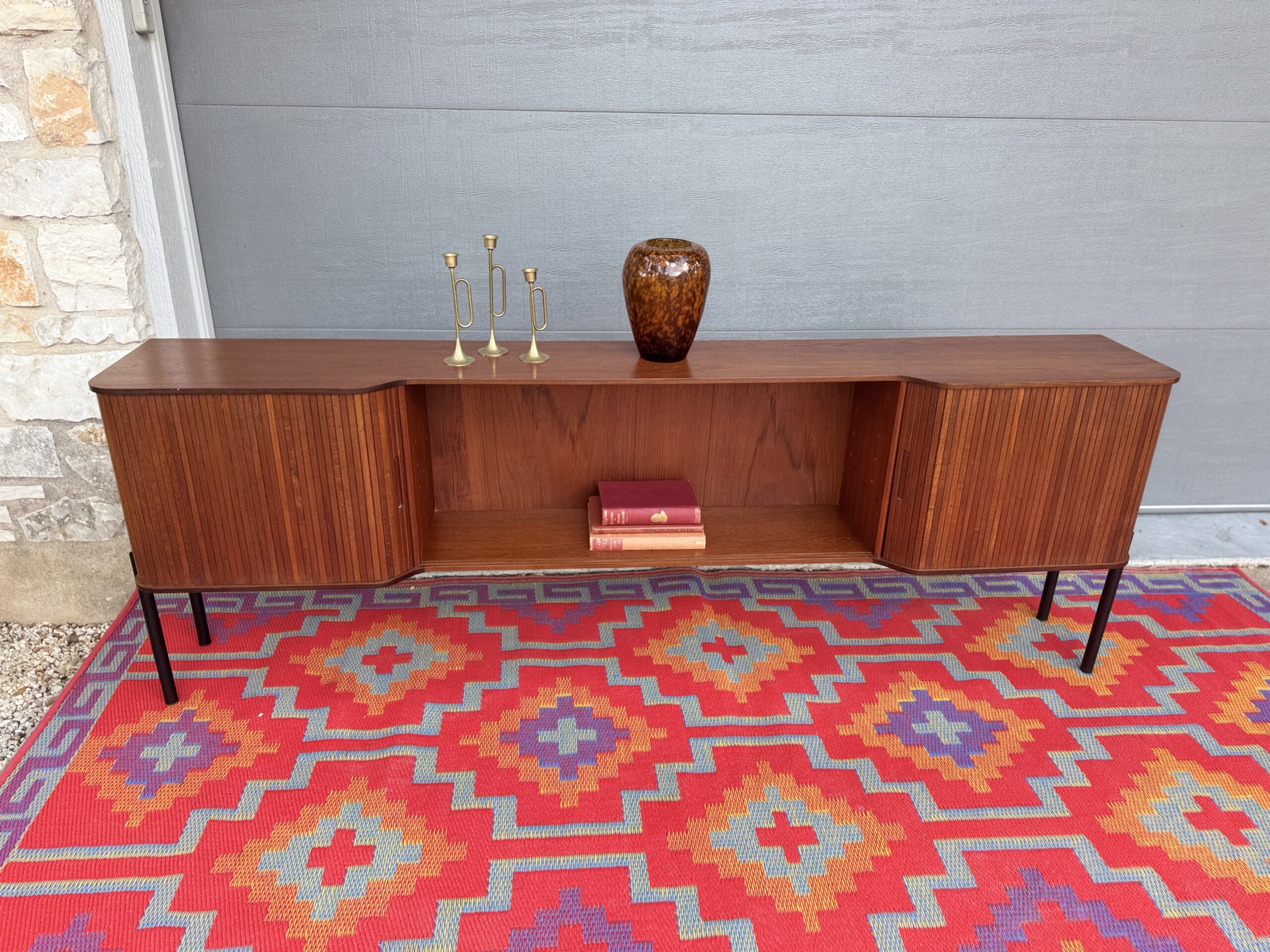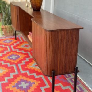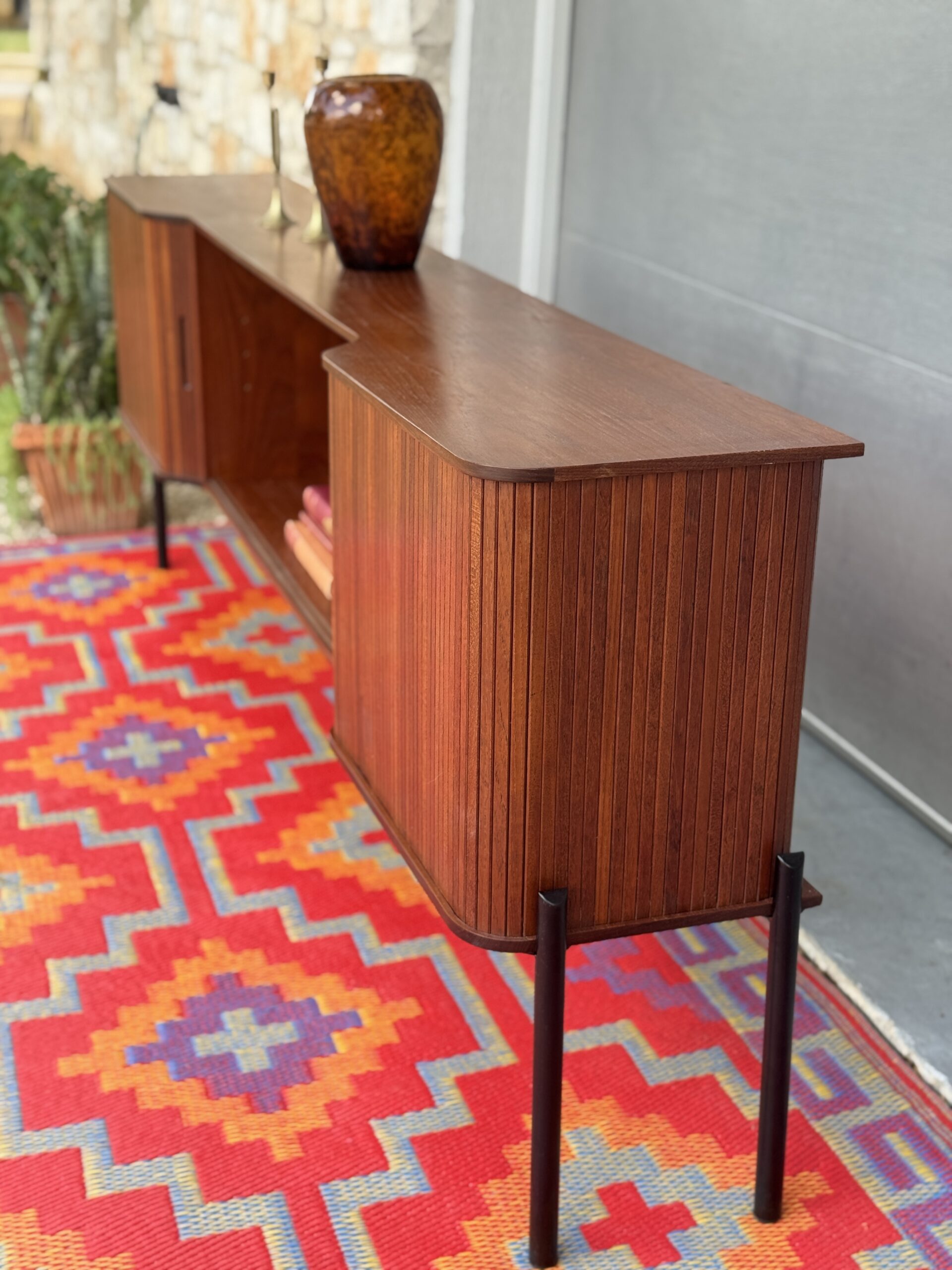 A sleek and long Danish Teak console that blends vintage craftsmanship with modern updates. This piece features smooth tambour doors that slide open to reveal adjustable shelving, perfect for storing records, books, or décor. The added black steel legs give it a clean, modern edge while maintaining its mid-century charm.