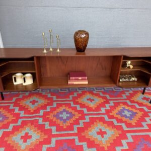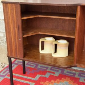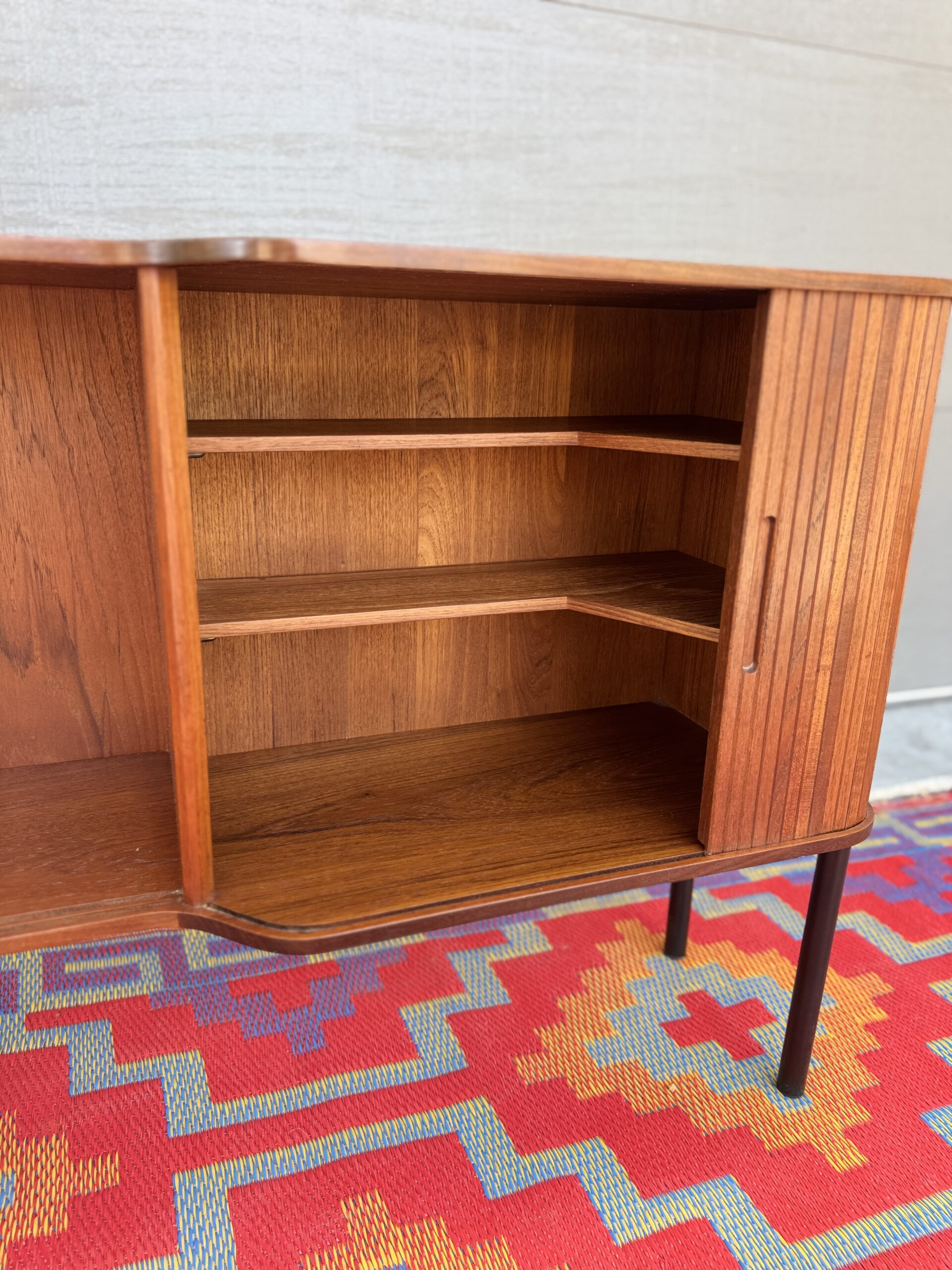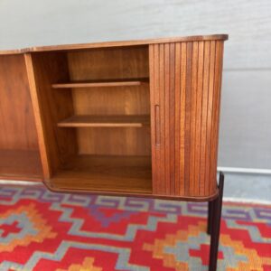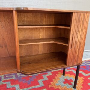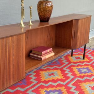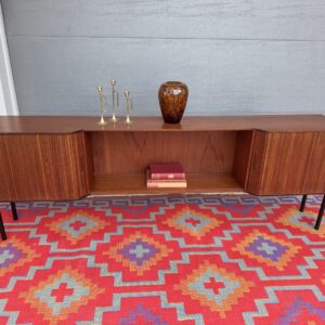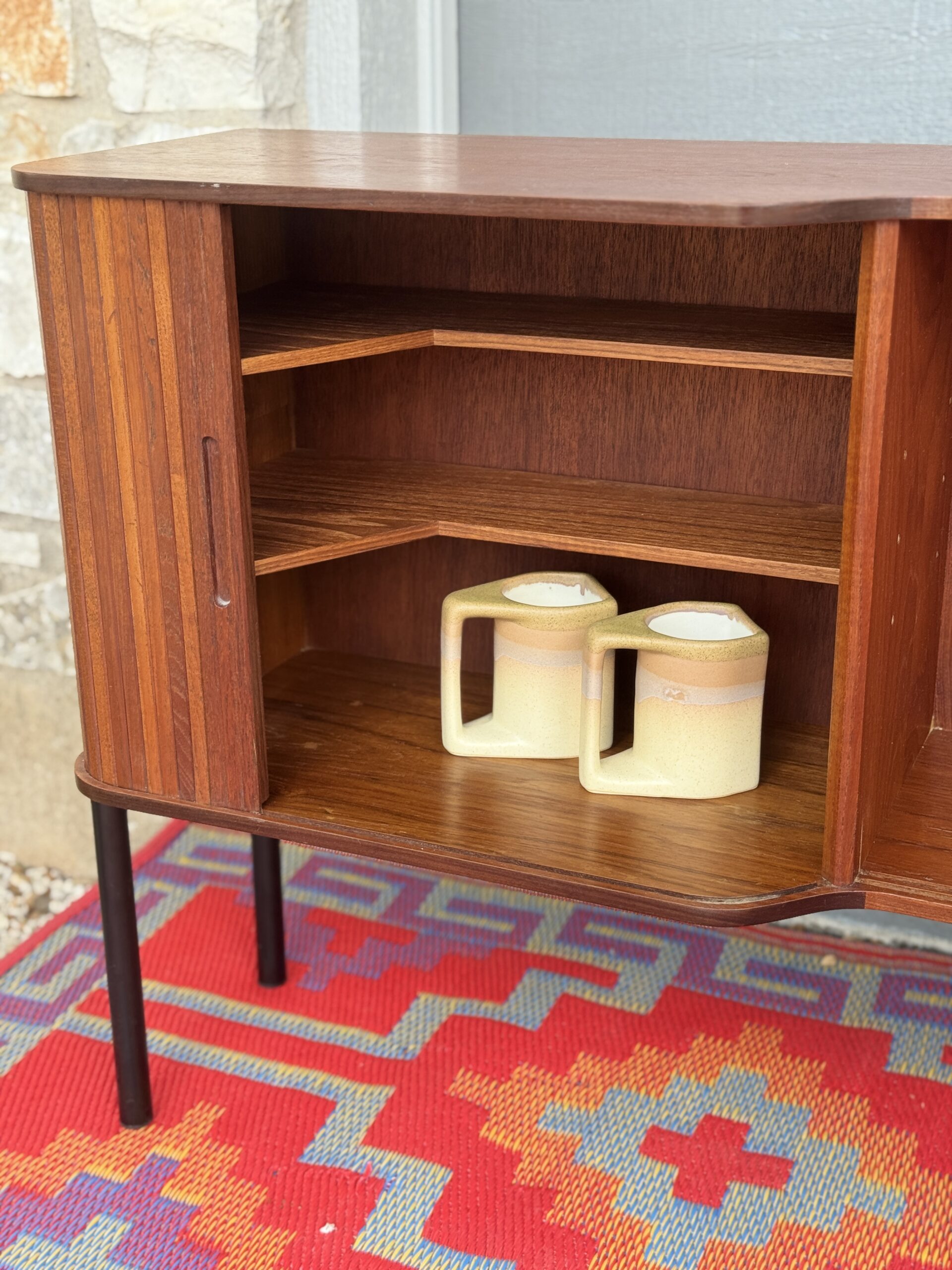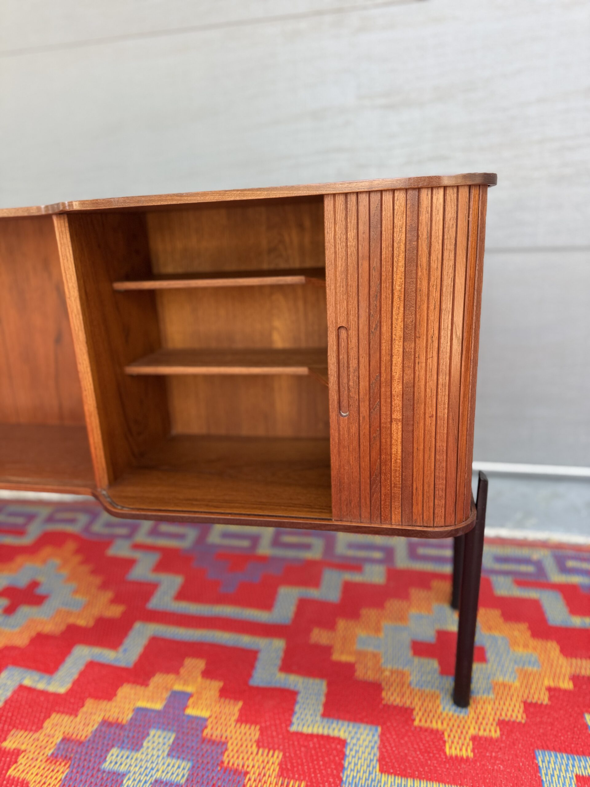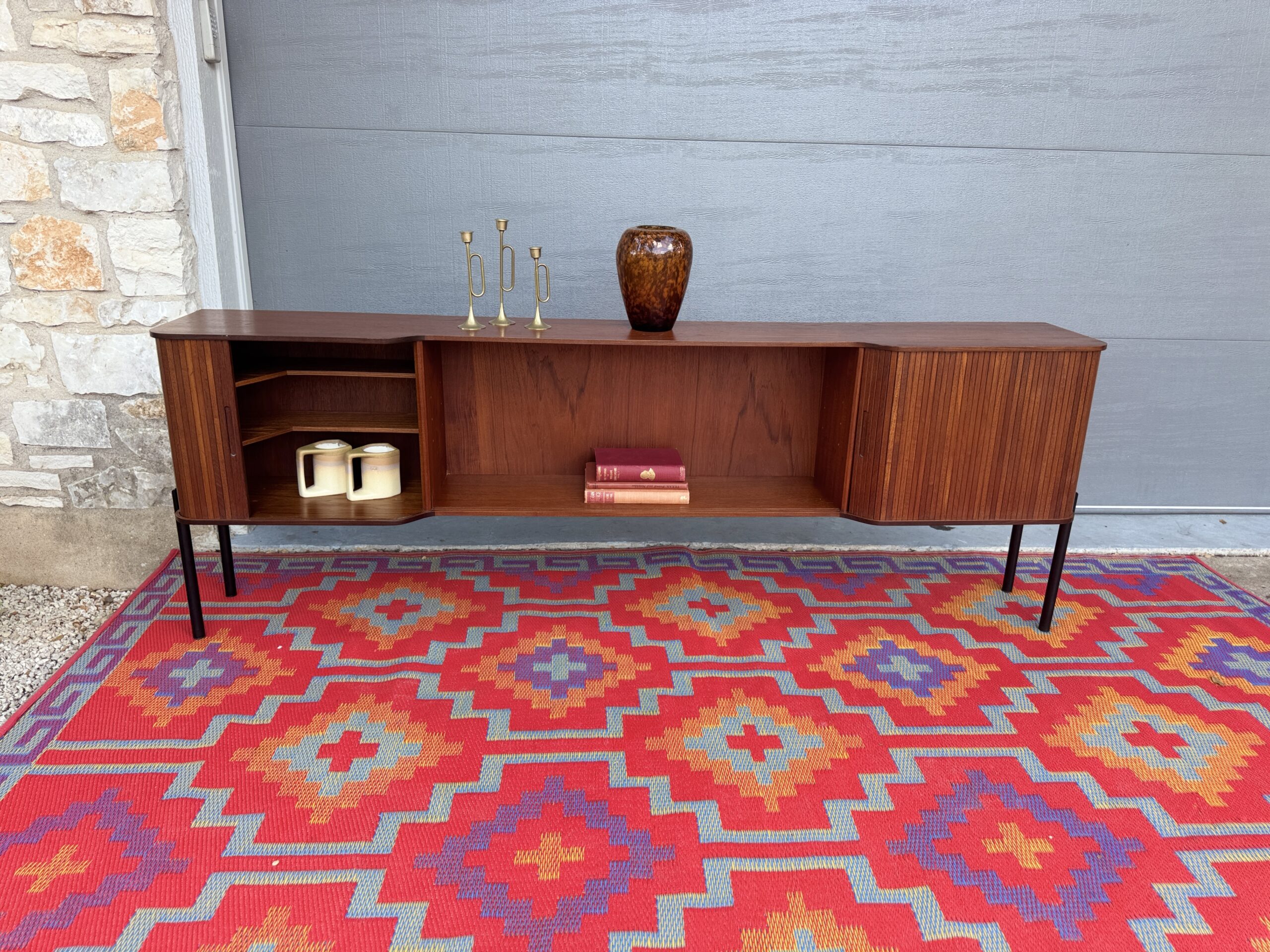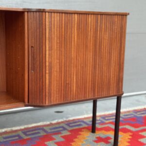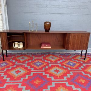 A sleek and long Danish Teak console that blends vintage craftsmanship with modern updates. This piece features smooth tambour doors that slide open to reveal adjustable shelving, perfect for storing records, books, or décor. The added black steel legs give it a clean, modern edge while maintaining its mid-century charm.