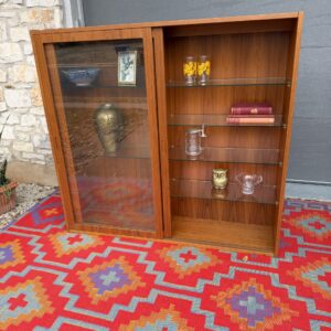This stunning Danish teak display cabinet features sleek sliding glass doors and a total of 8 adjustable glass shelves, offering beautiful flexibility for styling and storage. The warm teak tone paired with the clean glass lines makes this an ideal piece for showcasing barware, ceramics, books, collectibles, or vintage finds while keeping everything protected and dust-free.