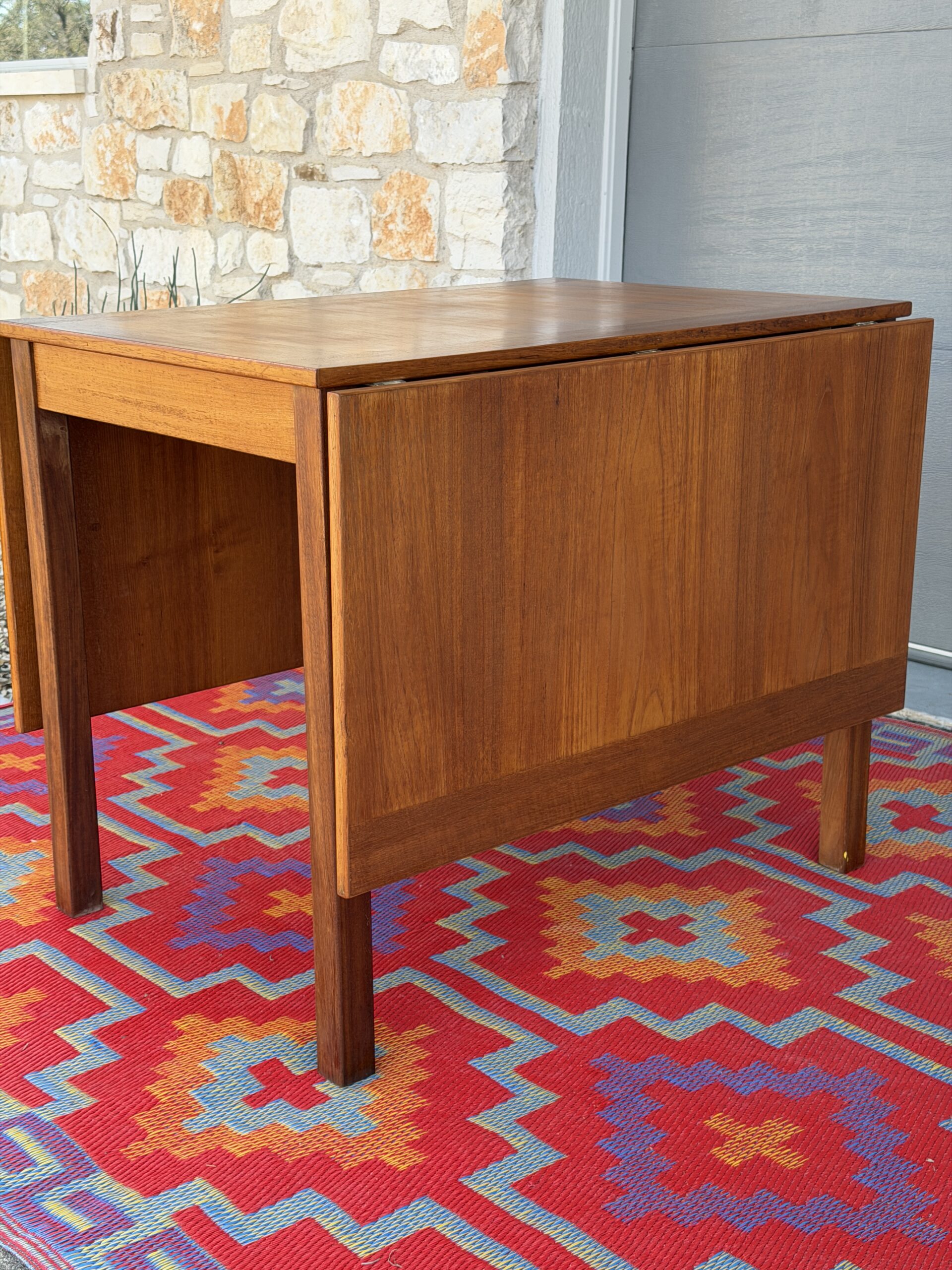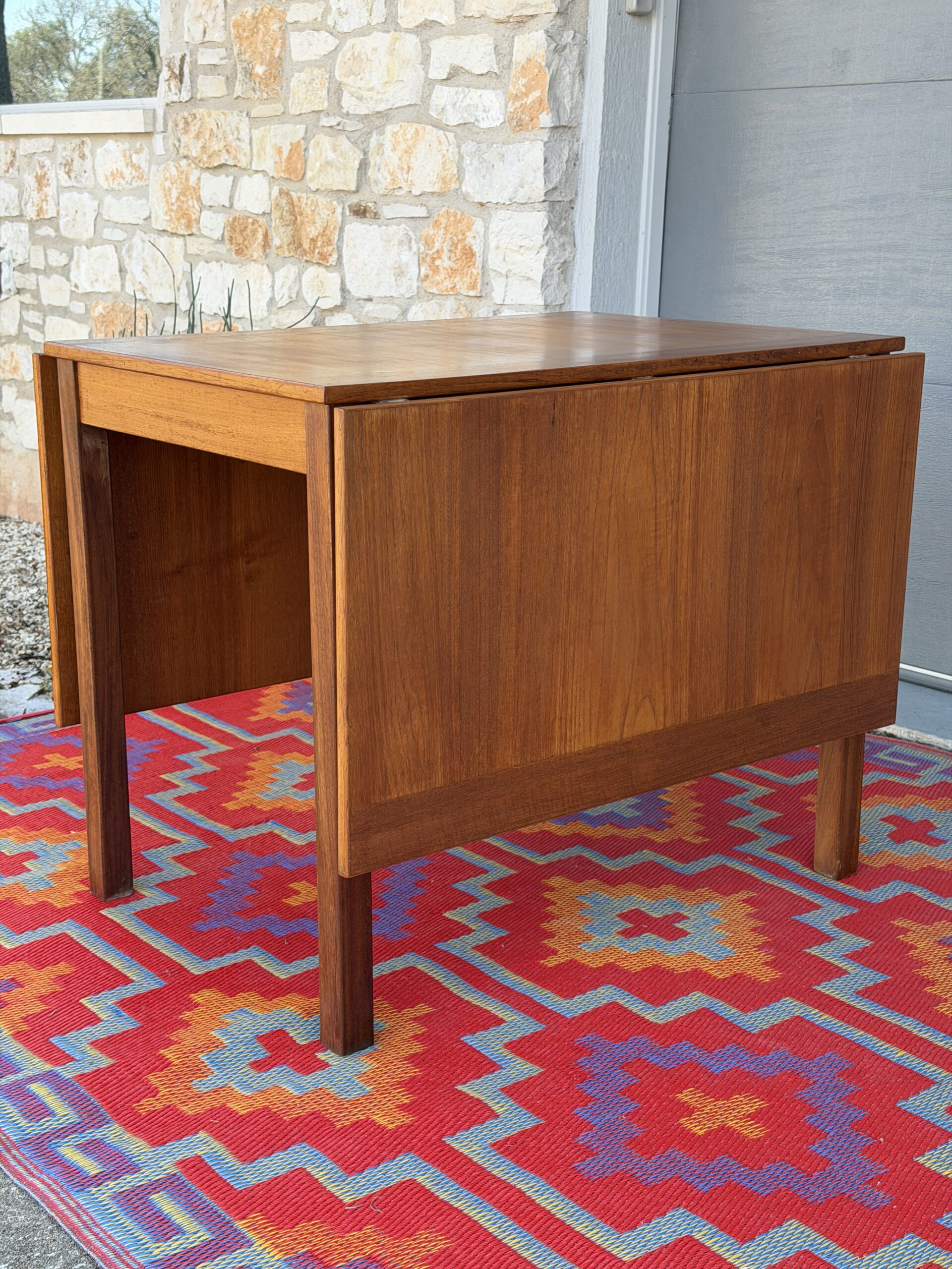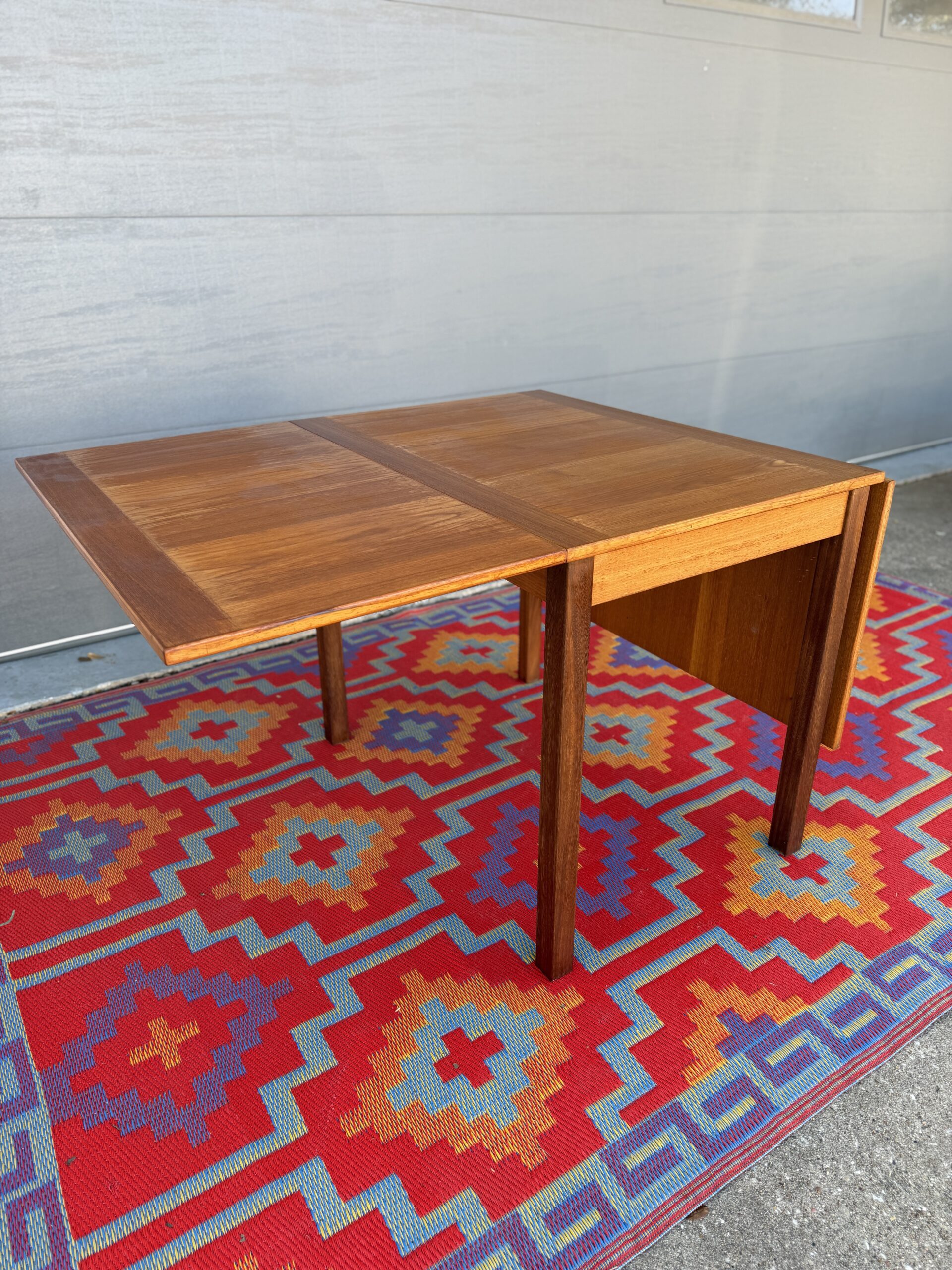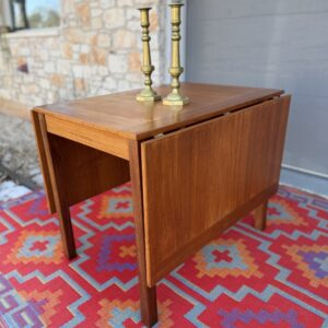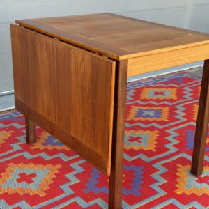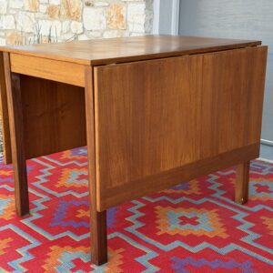 A thoughtfully designed Danish teak drop leaf dining table by Ansanger Møbler that offers incredible flexibility in a compact footprint. Each leaf can be extended outward, completely removed, or used together, making this an ideal solution for small spaces, apartments, or anyone who loves functional mid-century design.