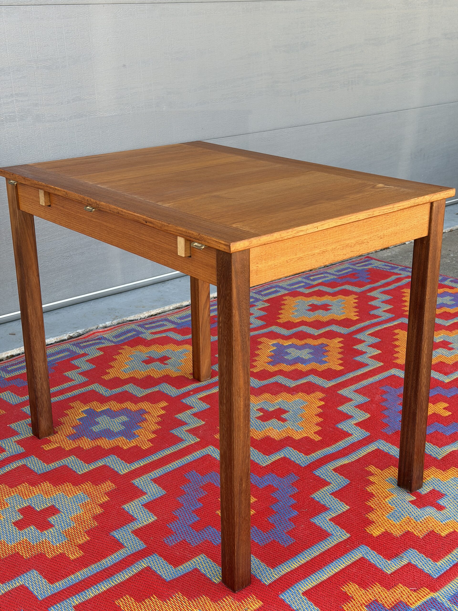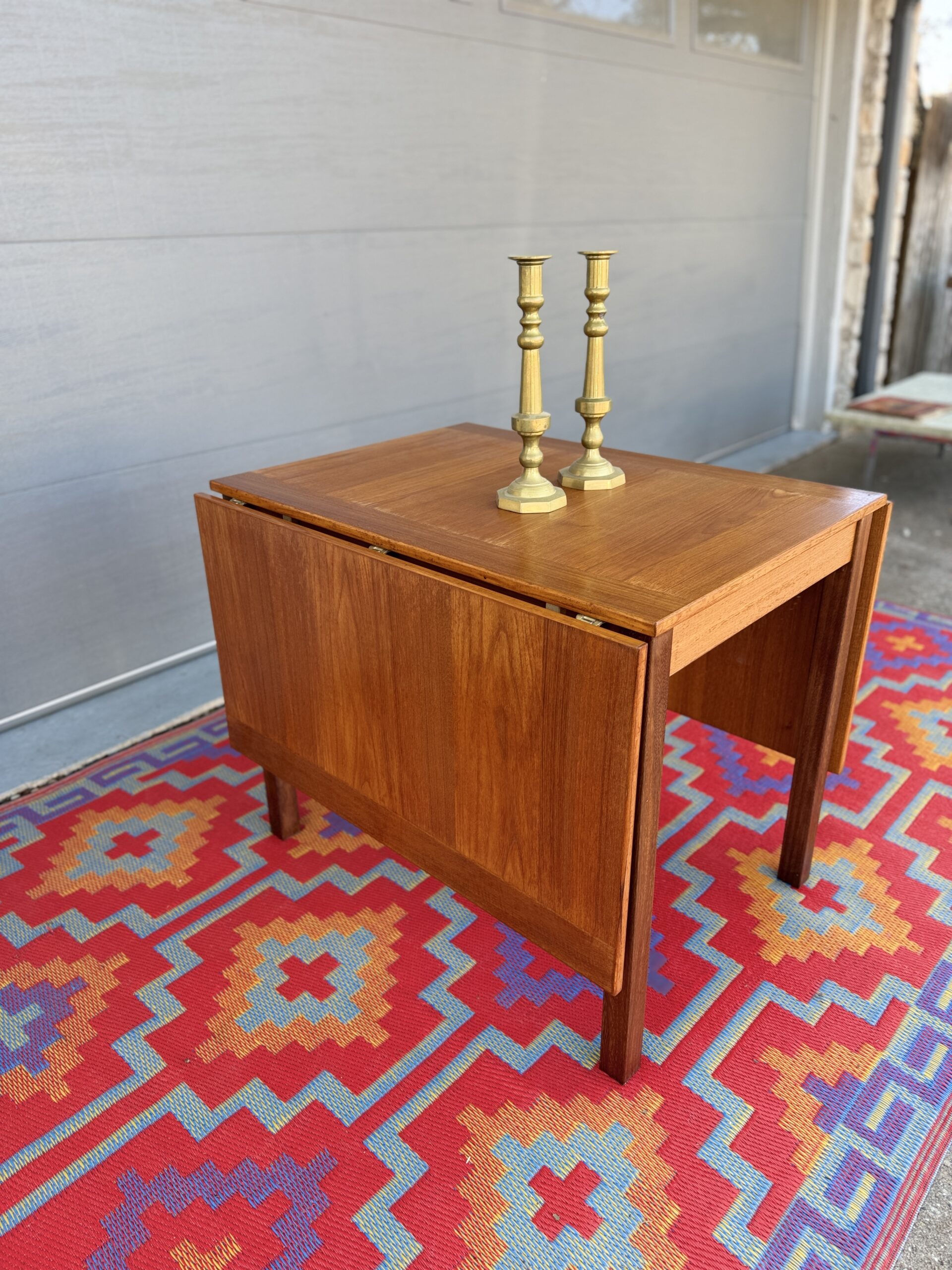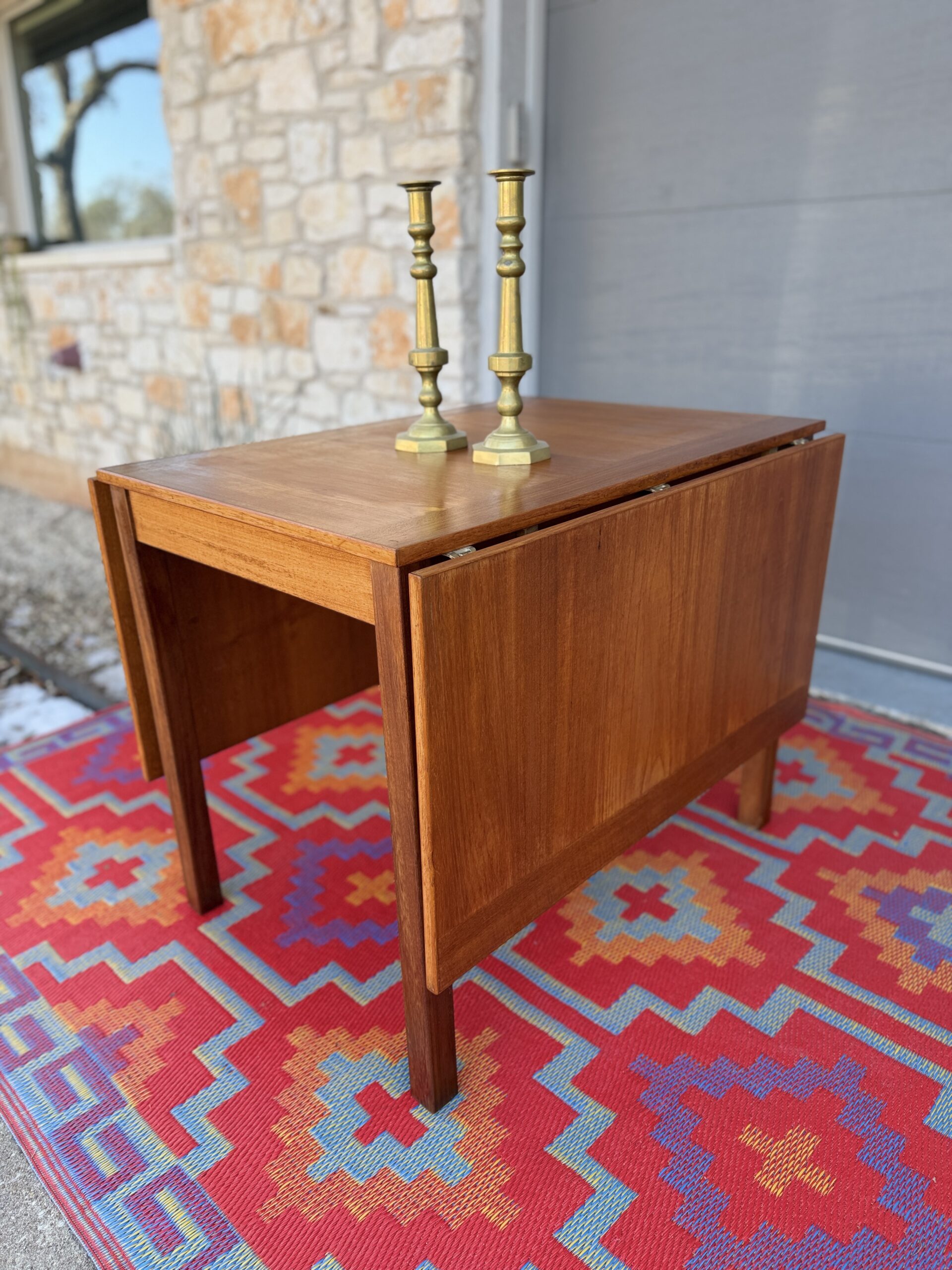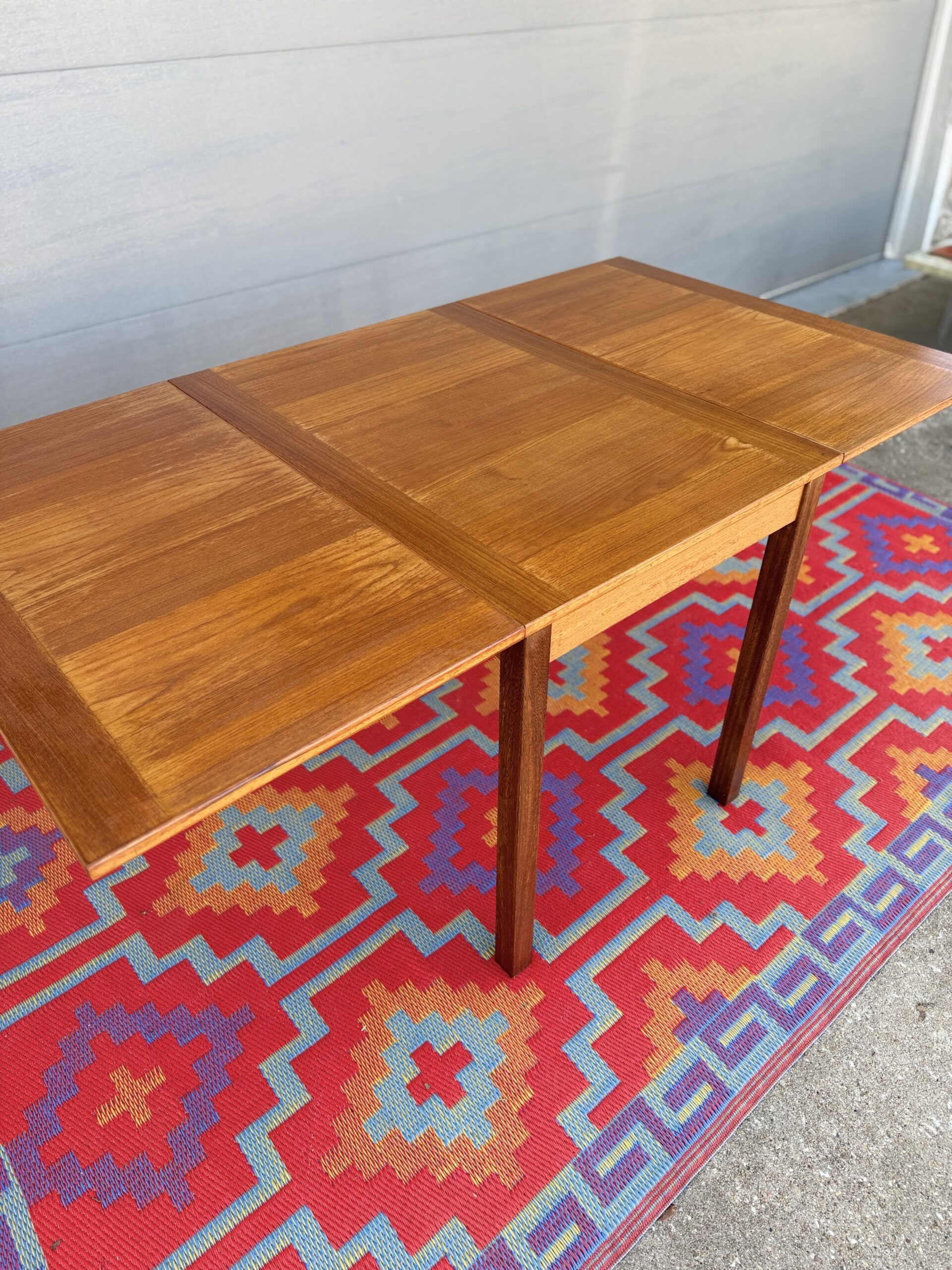 A thoughtfully designed Danish teak drop leaf dining table by Ansanger Møbler that offers incredible flexibility in a compact footprint. Each leaf can be extended outward, completely removed, or used together, making this an ideal solution for small spaces, apartments, or anyone who loves functional mid-century design.