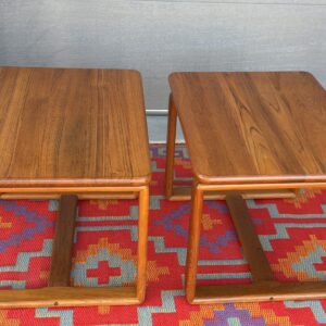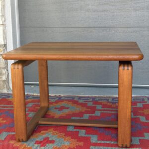 A beautifully crafted matching pair of solid teak side / end tables featuring clean lines and sculptural bentwood cube-style bases. These tables showcase professionally refinished rich teak grain, softly rounded edges, and a timeless silhouette that works effortlessly beside a sofa, lounge chairs, or as bedside tables.
