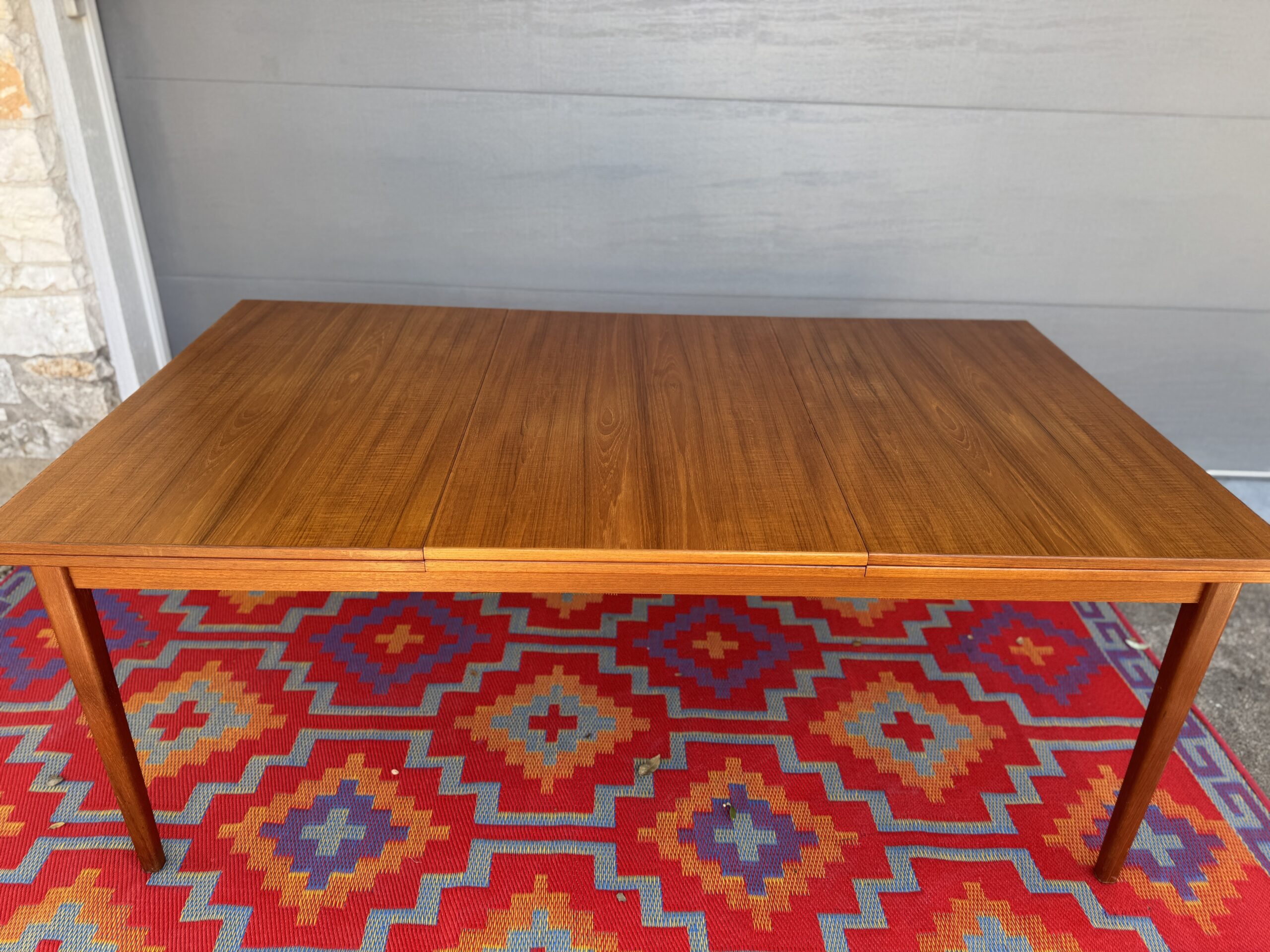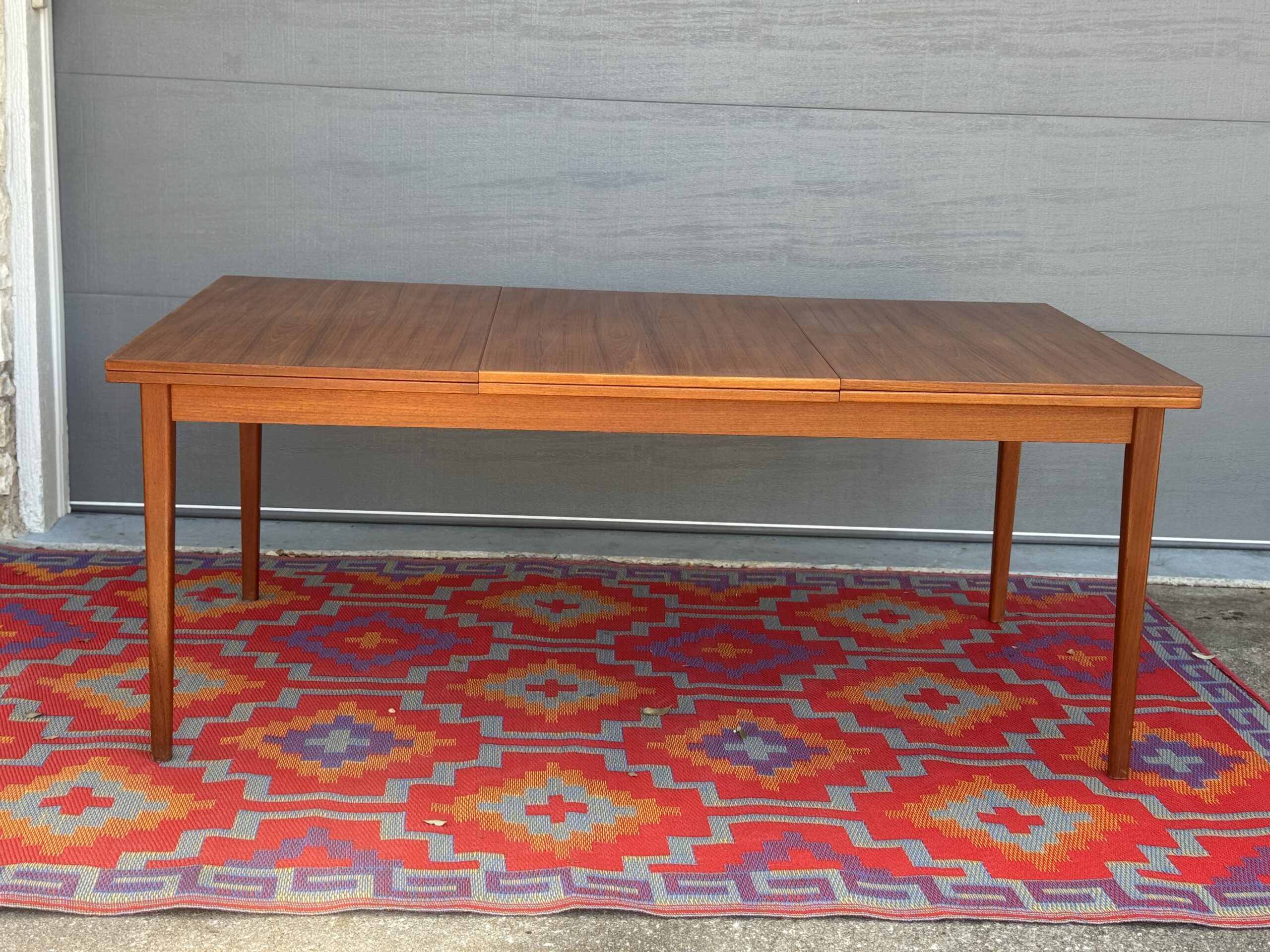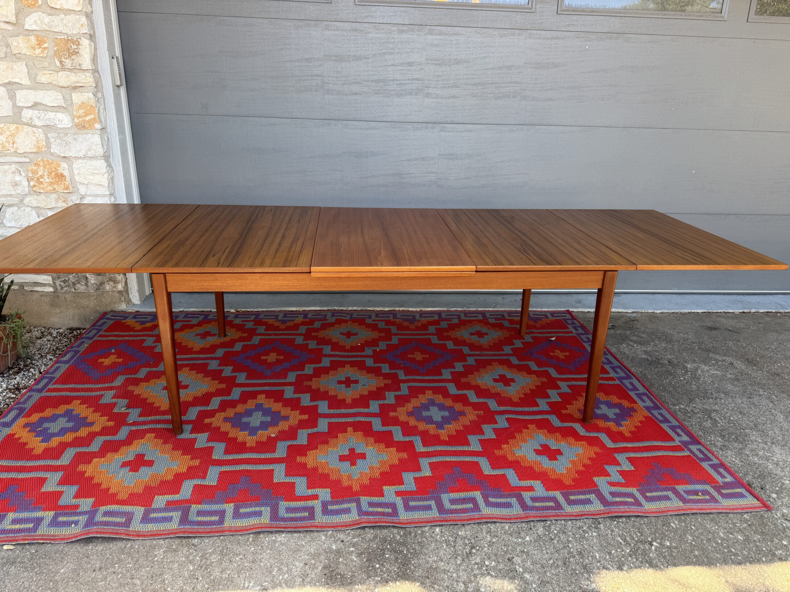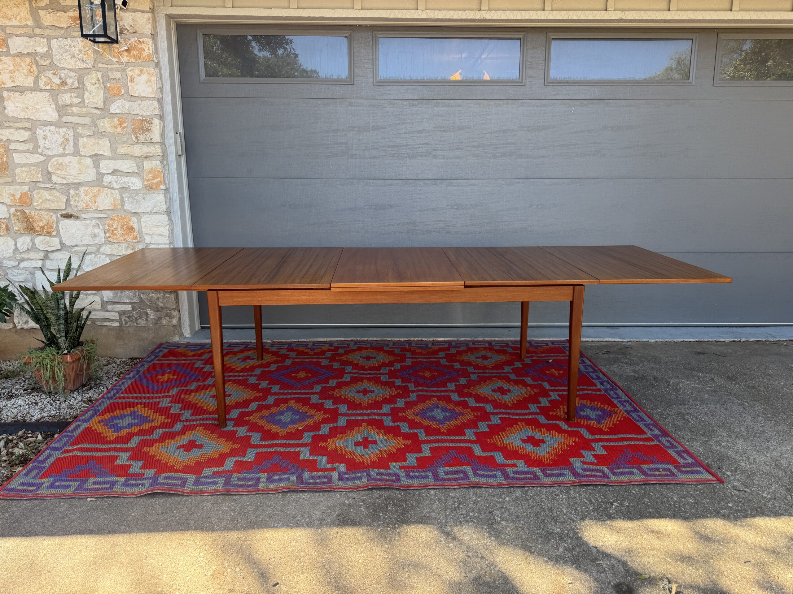 This vintage teak dining table by Skaraborgs Tibro of Sweden features sleek flip-top dual extension leaves, creating a truly versatile piece that adapts from everyday meals to full dinner parties with ease.