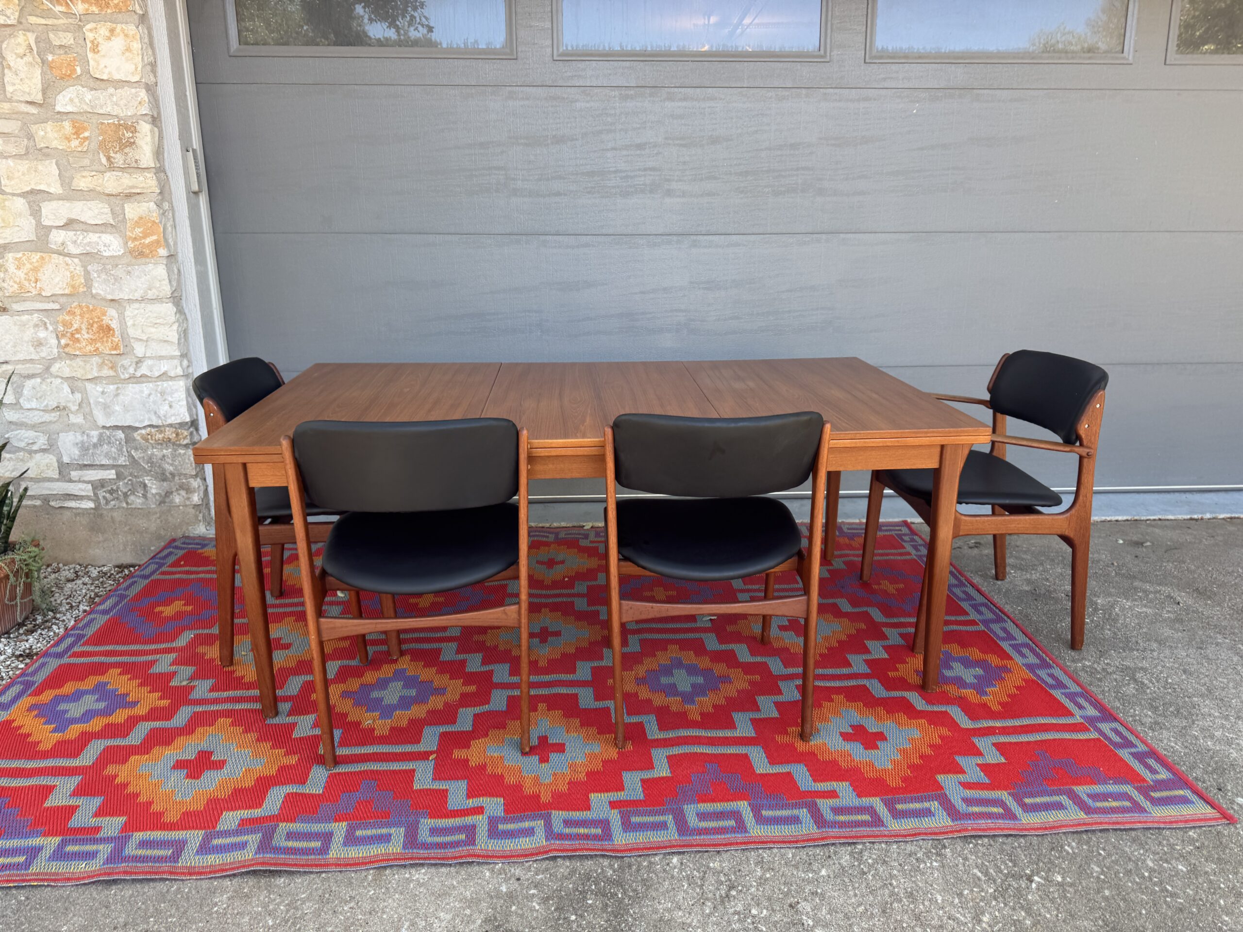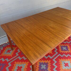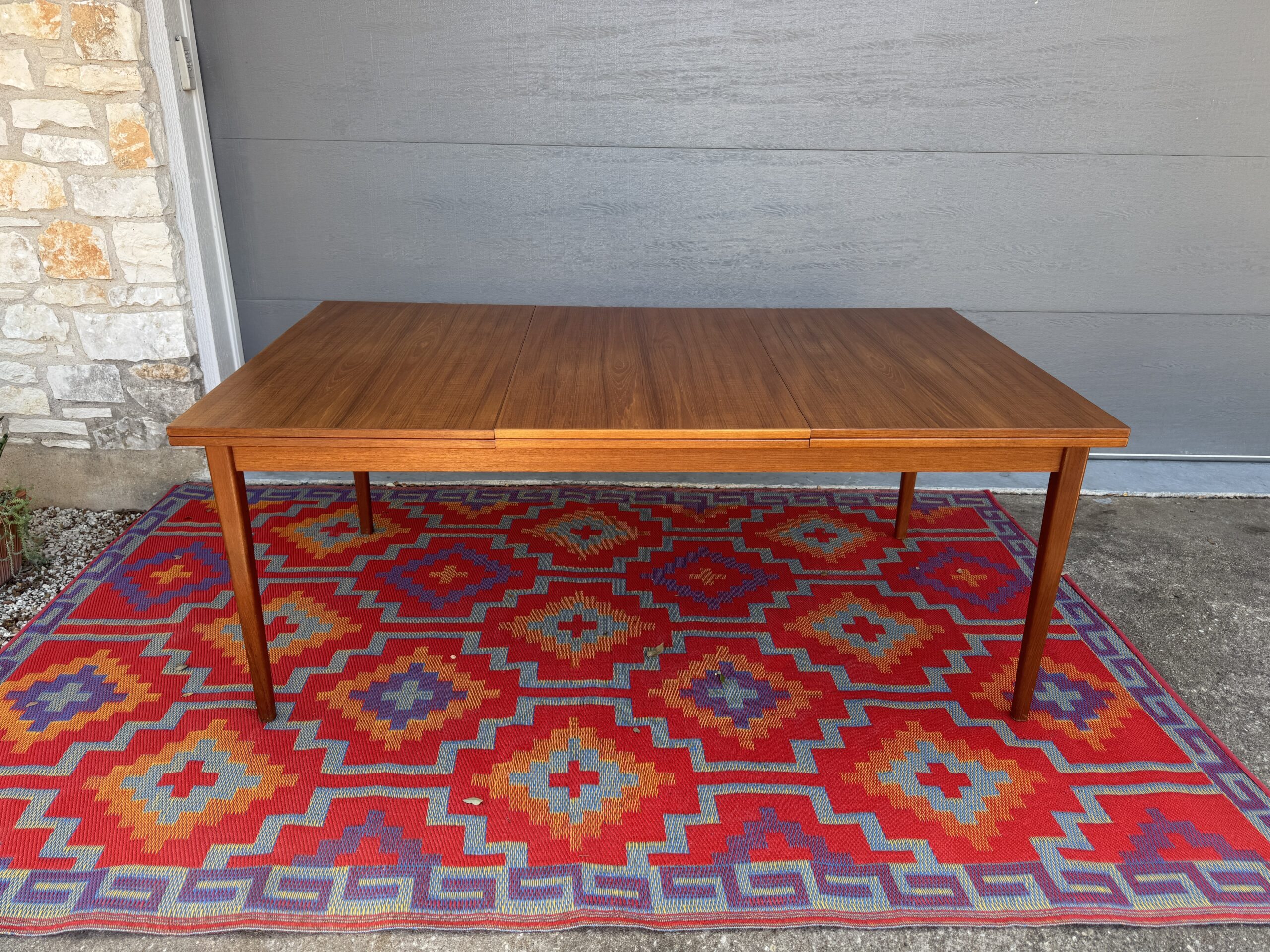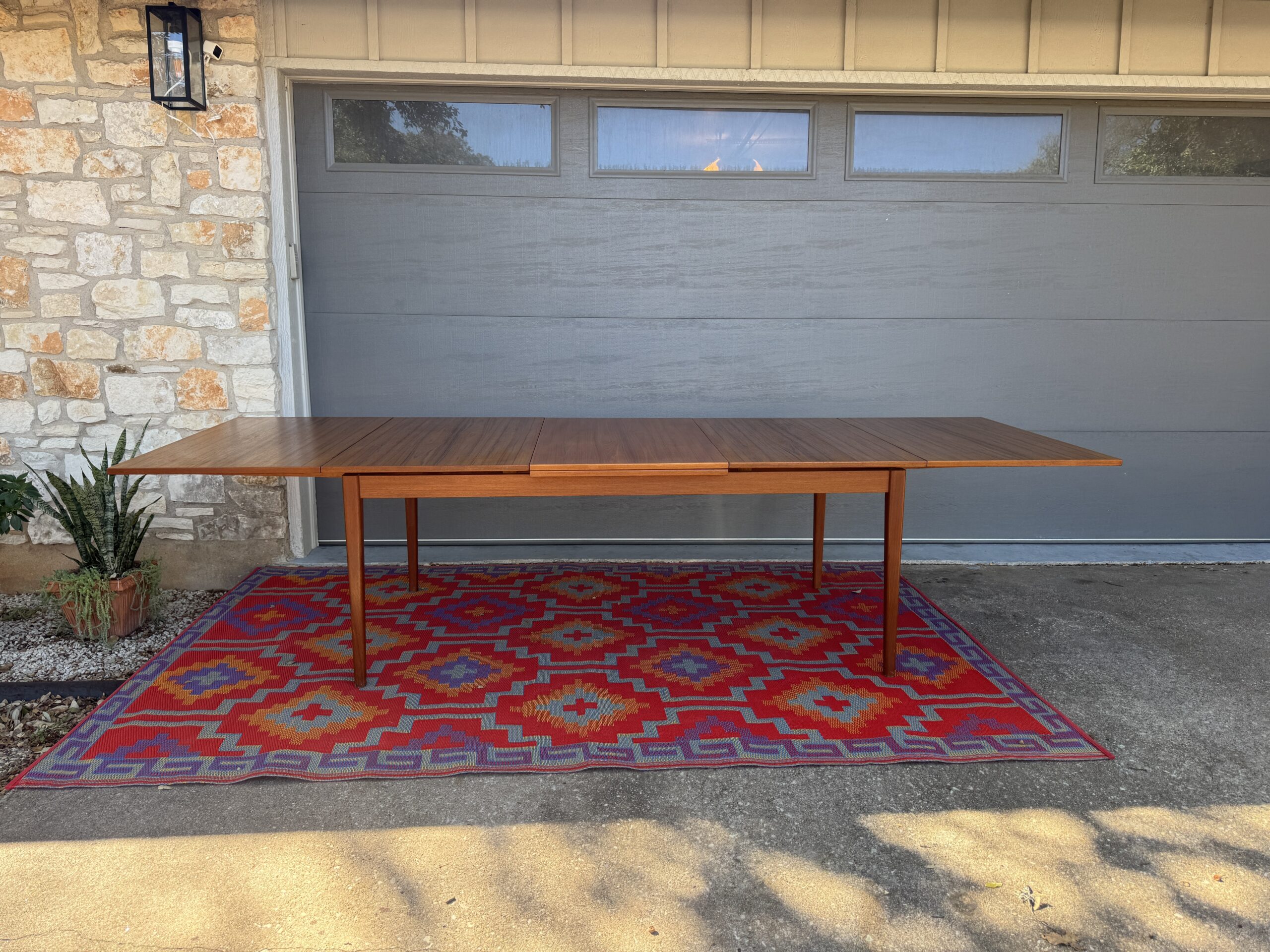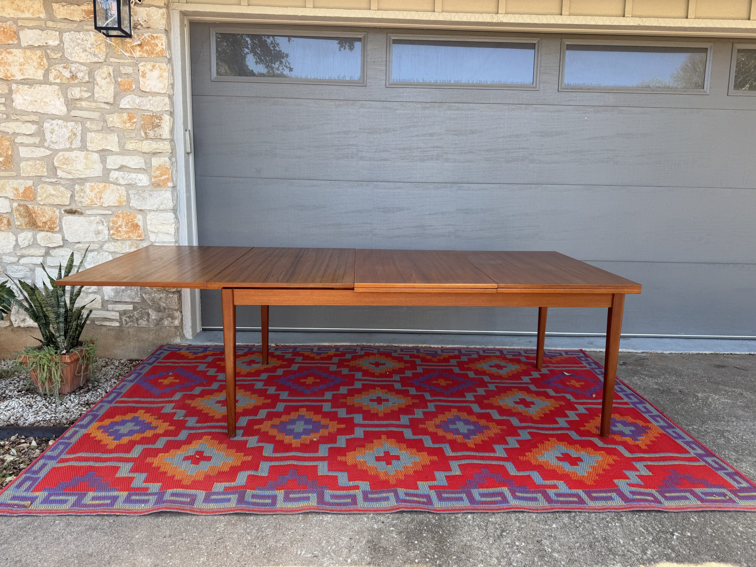 This vintage teak dining table by Skaraborgs Tibro of Sweden features sleek flip-top dual extension leaves, creating a truly versatile piece that adapts from everyday meals to full dinner parties with ease.