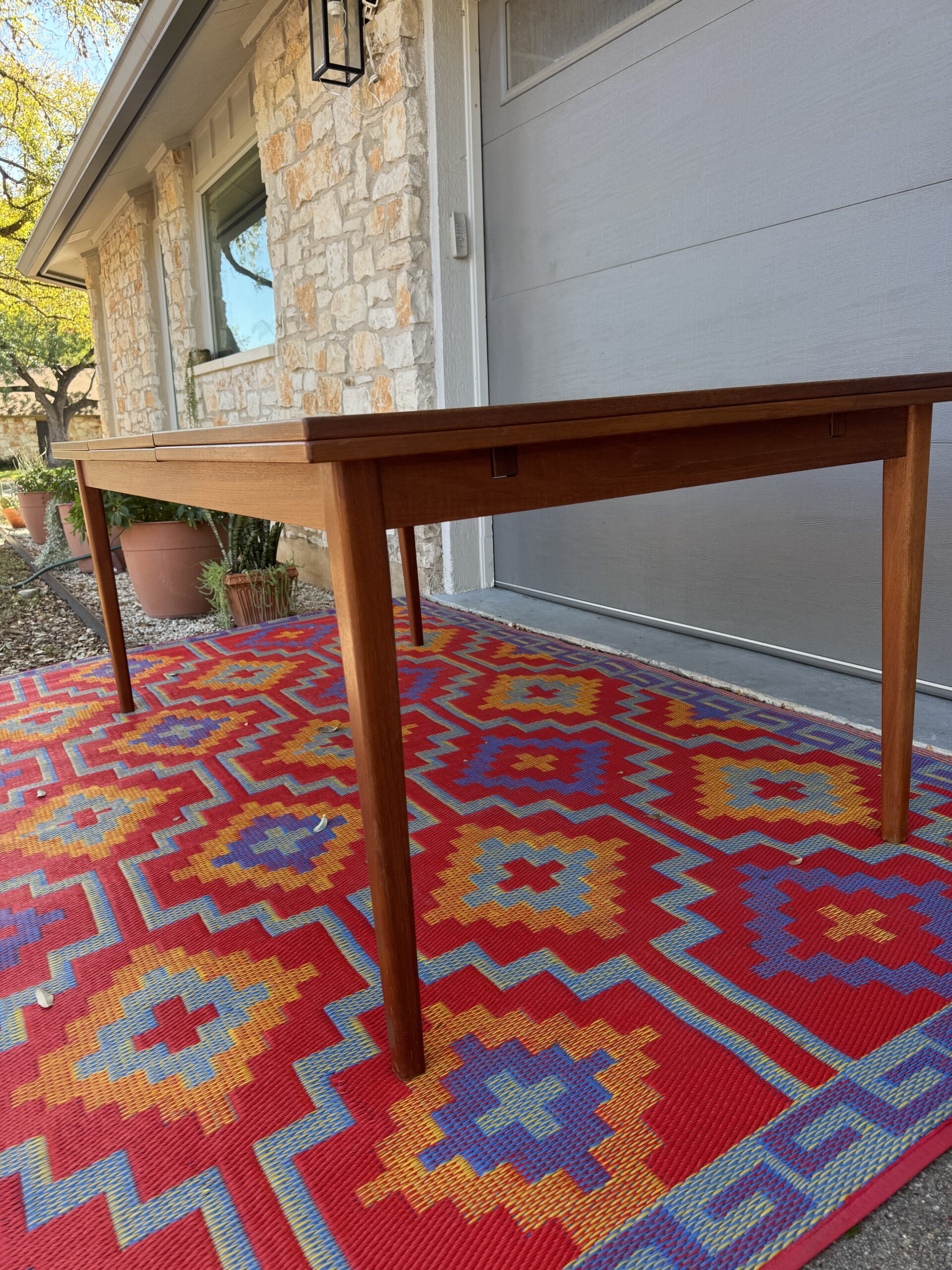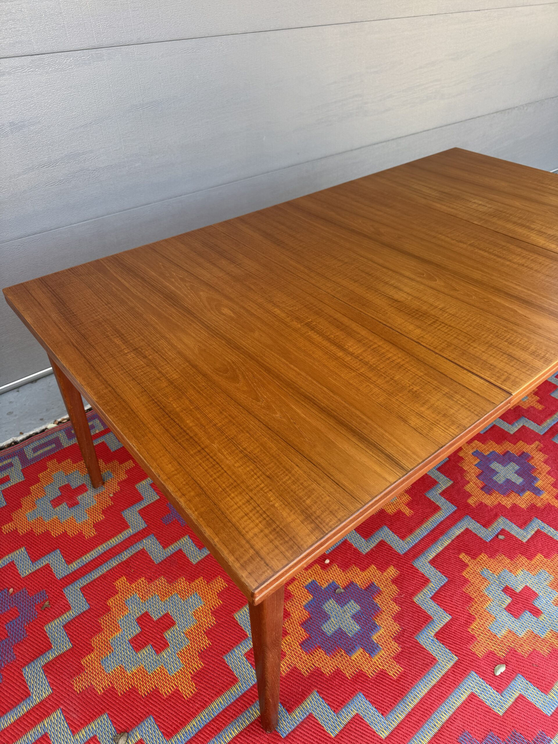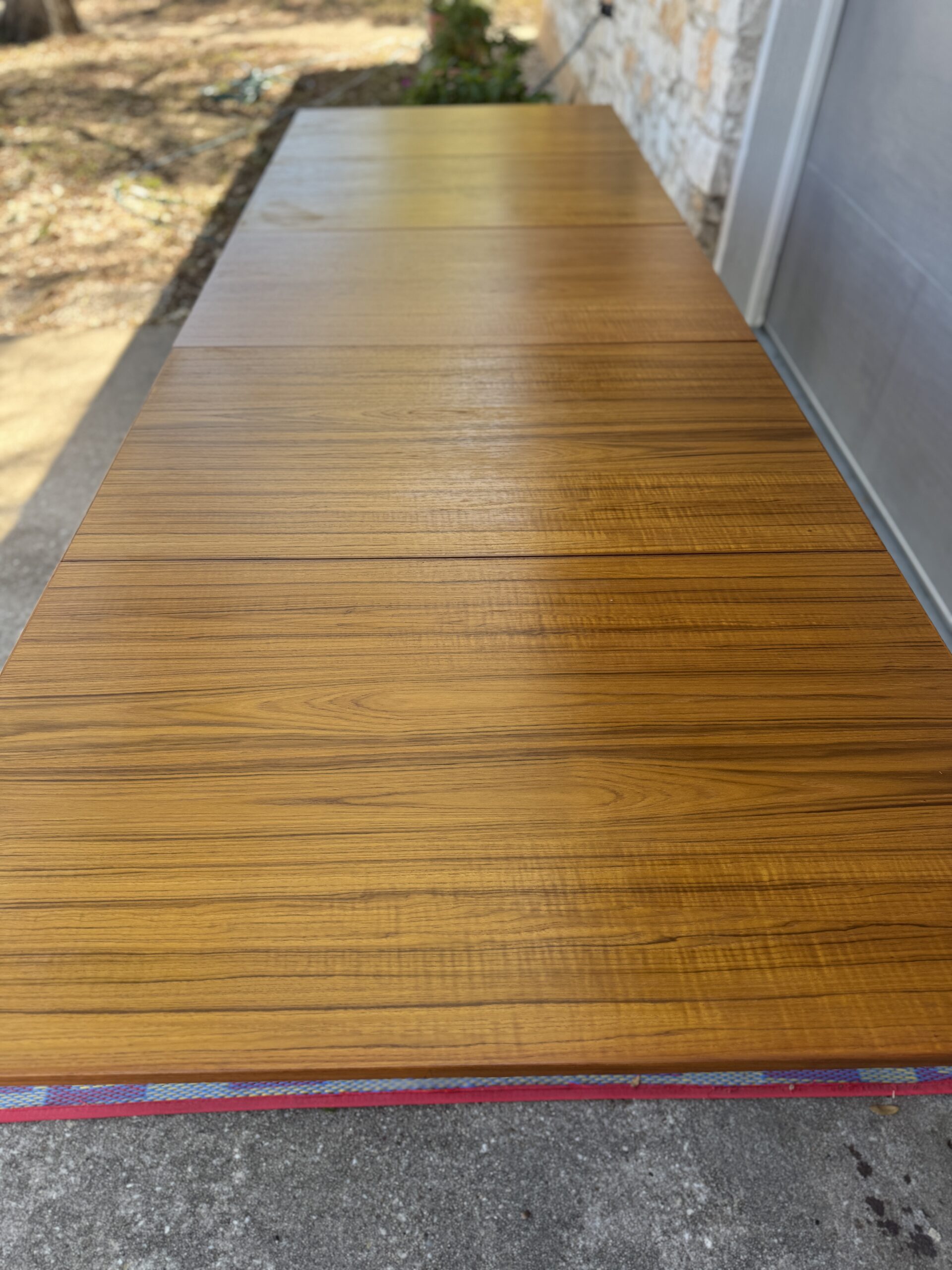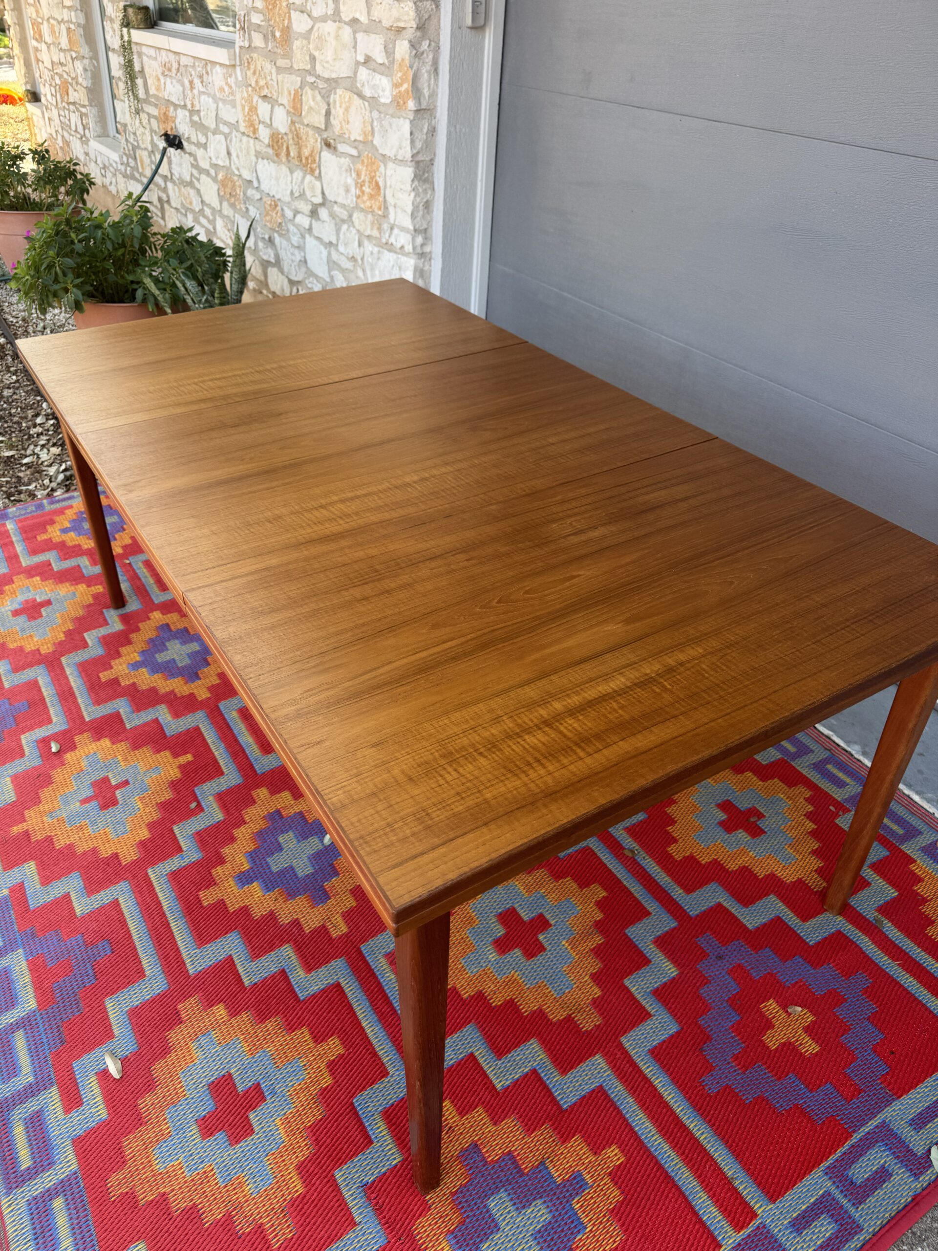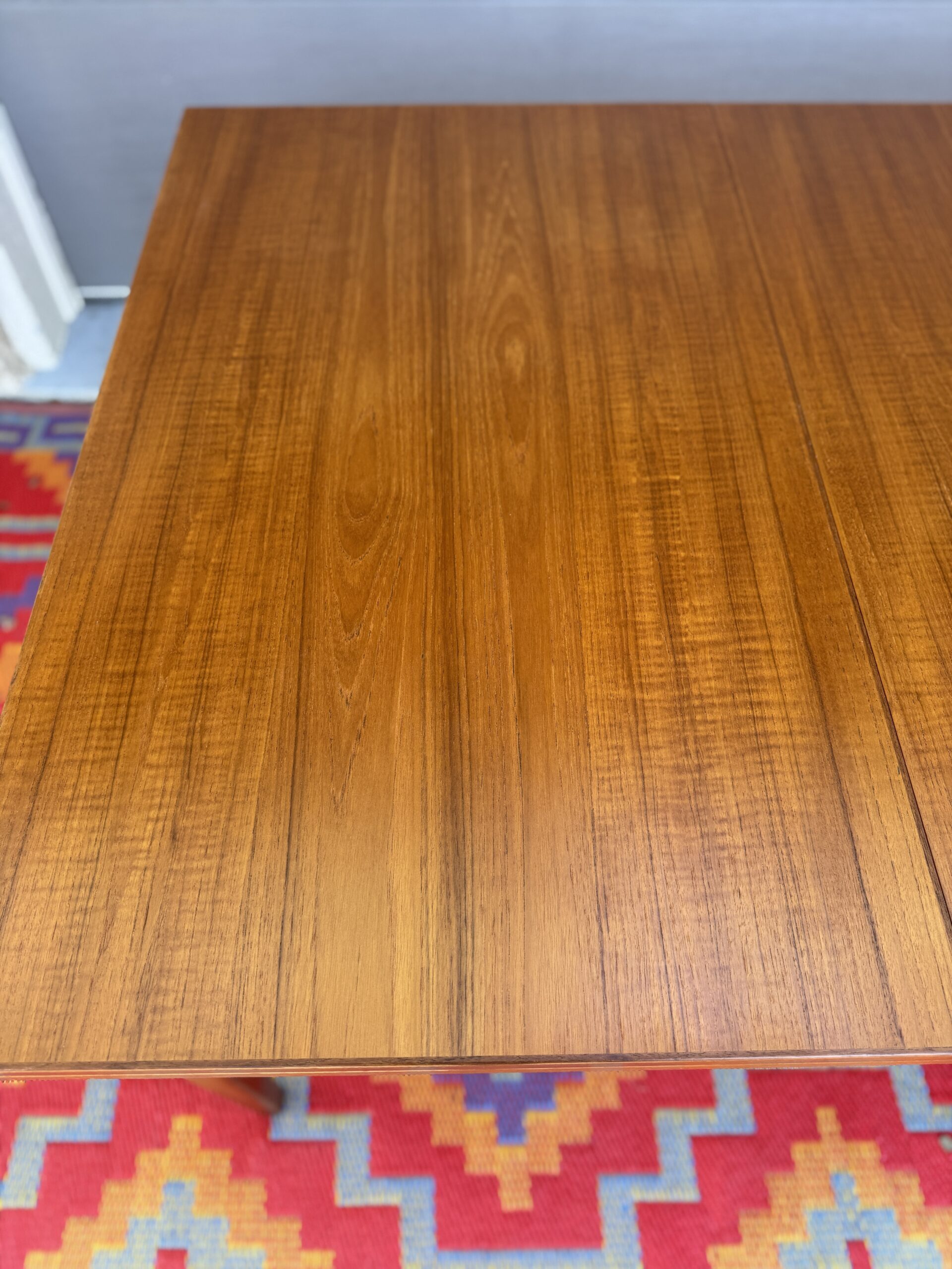 Gorgeous solid teak tabletop has been refinished and the table is in excellent vintage condition.
