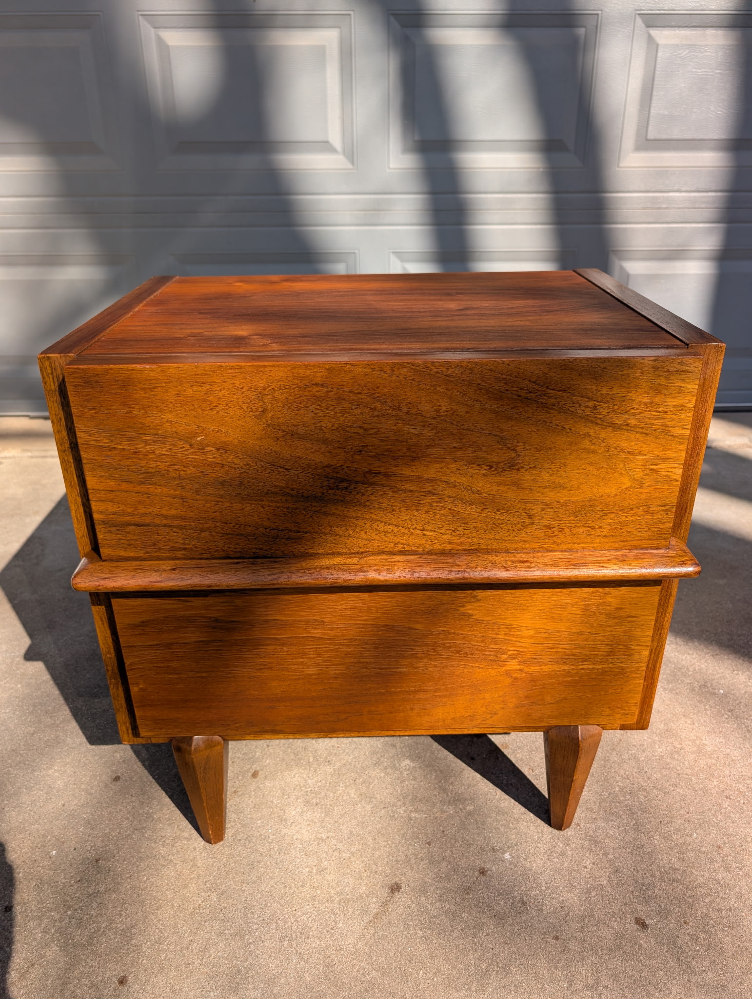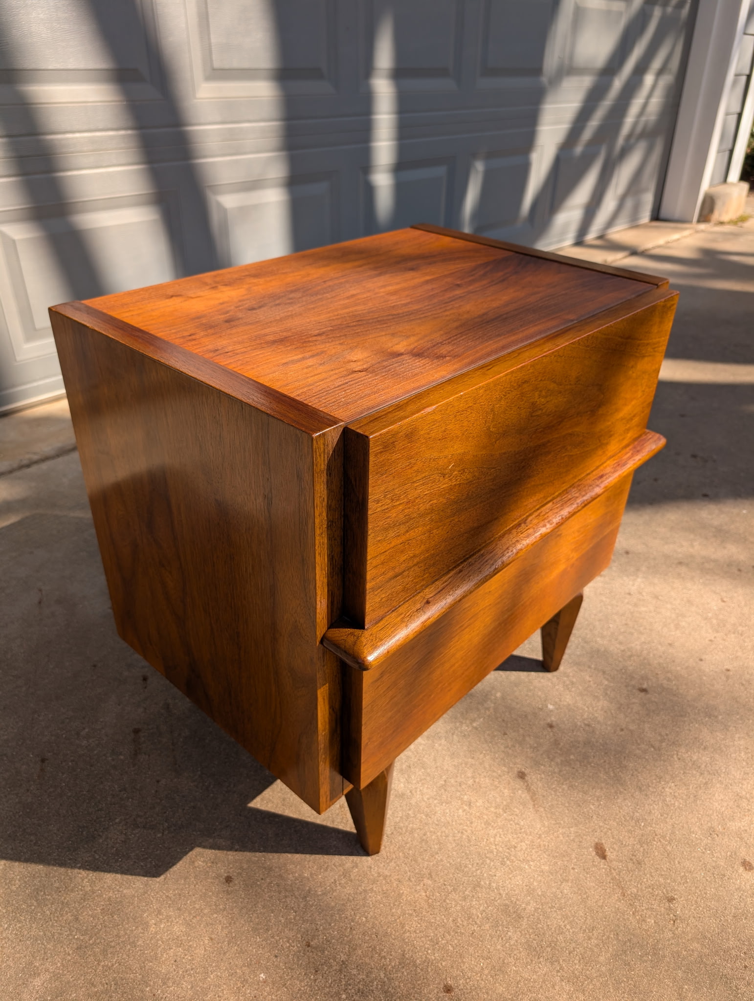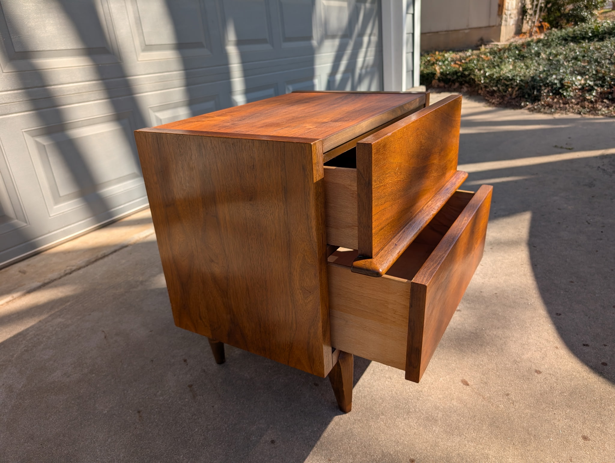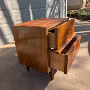 A timeless mid-century walnut nightstand by American of Martinsville featuring clean lines, sculpted stretcher detail across the drawer fronts, and tapered legs.