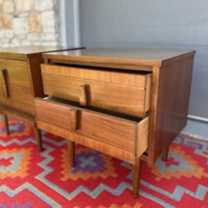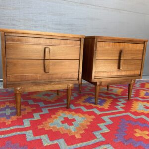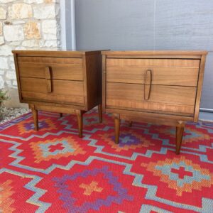 Add timeless charm and function to your space with this stunning pair of vintage nightstands. True mid-century modern style, each piece features a rich walnut finish, sculptural burl wood drawer pulls, tapered legs, and a durable laminate top that resists wear and moisture. The two spacious sliding drawers provide ample storage, making them ideal for bedside organization or as stylish end tables.