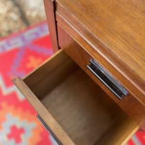 Six drawers, with original sculpted black pulls, offering ample storage.
