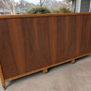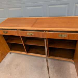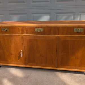 The layout offers generous storage with three upper drawers and spacious cabinet storage below, including shelving for versatile organization. The bottom three cabinet doors can also be locked with a key, suitable for a dining room buffet or bar. The finished back allows this piece to float in a room, making it ideal for open-concept spaces or used as a room divider.
