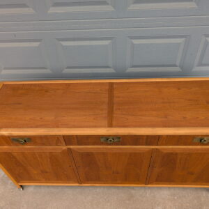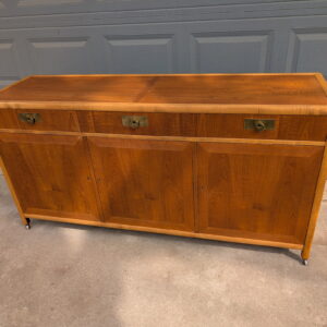 A beautiful walnut and oak credenza by Baker Furniture, featuring exceptional wood grain, streamlined profile, and elegant brass hardware. This piece has been freshly refinished, bringing out the warmth of the wood while preserving its classic mid-century character.