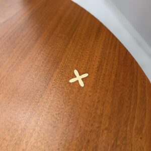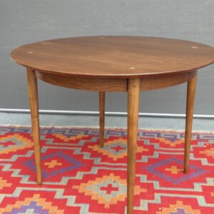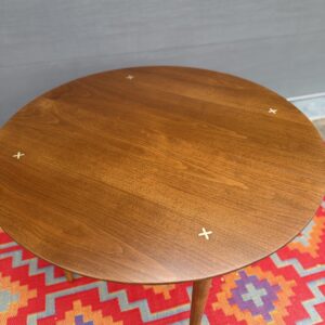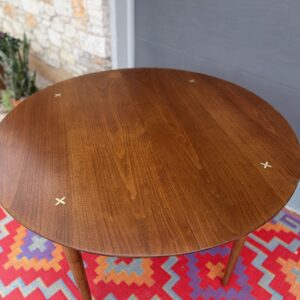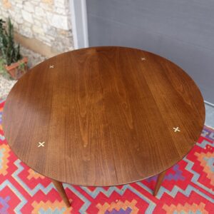 This stunning vintage round dining table by American of Martinsville showcases the brand’s iconic craftsmanship—warm walnut grain, tapered long legs, and four distinctive brass “X” inlays that elevate the design with subtle mid-century flair.