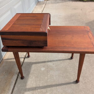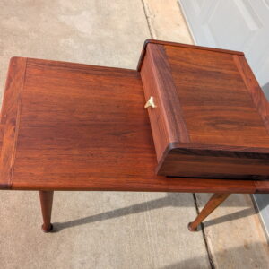 Beautiful mid-century walnut step side table featuring a two-tier design with a raised upper platform and integrated drawer.