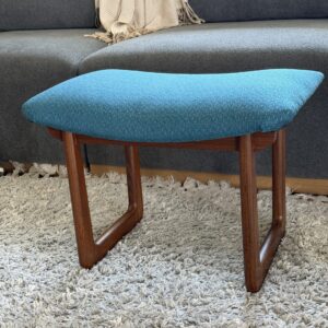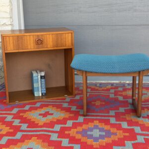A beautiful vintage walnut stool by Uniflex, featuring sculptural mid-century lines and newly upholstered seating in a vibrant blue geometric patterned fabric.